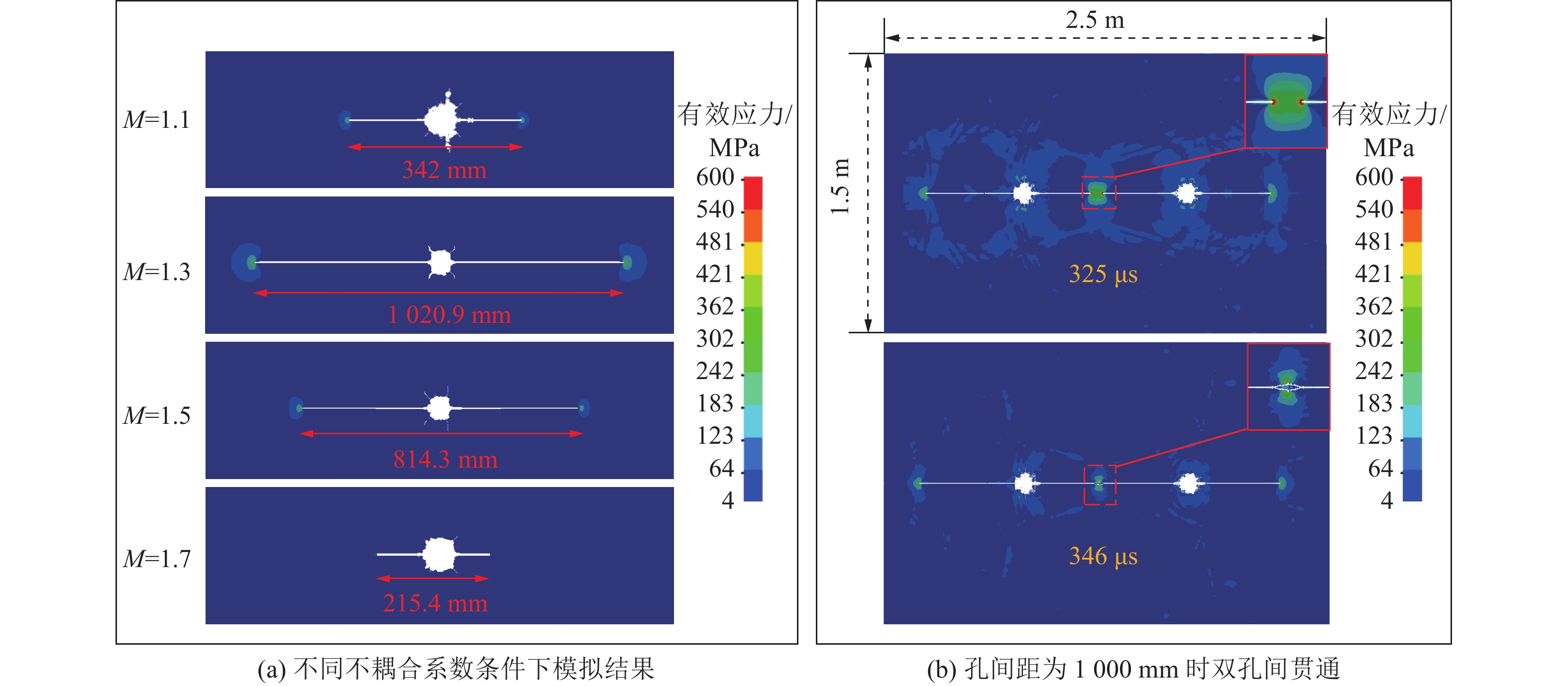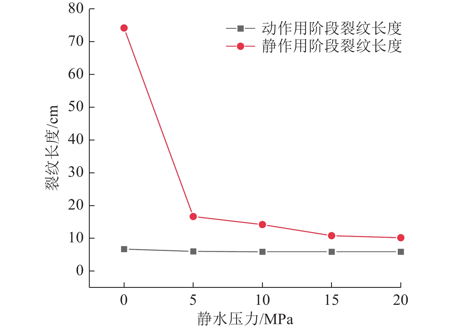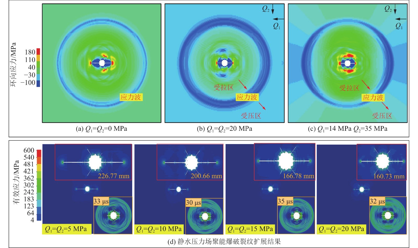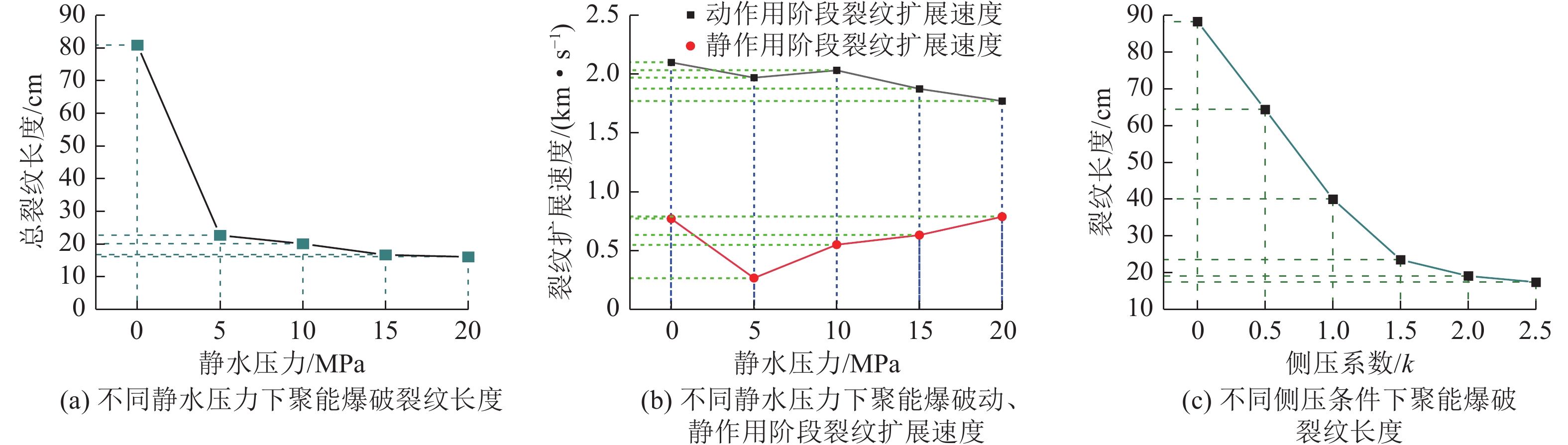Deep hard rock blasting is a free surface blasting process under the coupling effect of explosive dynamic and static load and in-situ stress. In-situ stress has a strong inhibition effect on blasting crack propagation, which greatly limits the application of deep hole blasting in the engineering of hard rock pre-weakening and roof cutting and pressure relief. In order to clarify the action mechanism of stress wave and explosive gas on crack initiation and propagation in infinite rock blasting under the influence of in-situ stress, based on explosion mechanics and fracture mechanics, the length of guided crack in shaped charge blasting action was theoretically deduced. Combined with LS-DYNA software, the process of crack initiation and propagation in rock under dynamic and static action of shaped charge blasting with or without the influence of ground stress is simulated and analyzed visually. The results show that: 1) The numerical simulation results indicate that the time cut-off point of dynamic and static action is 32 μs, and the phase of shaped charge blasting action is dominant for crack initiation and initial propagation. The static action of explosive gas is the dominant factor for crack propagation. 2) When there is no in-situ stress, the crack propagation length in the phase of static action is 11 times longer than that in the phase of stress wave action. Compared with the condition without in-situ stress, when the in-situ stress is 20 MPa, the crack length in the action stage of shaped blasting is inhibited by 12.4%, and the crack length in the static action stage is inhibited by 86.3%. The in-situ stress mainly inhibits the crack growth in the static action stage of the later explosive gas. When the lateral stress is perpendicular to the direction of crack growth, the inhibitory effect decreases with the increase of the lateral stress. 3) Based on the background of roof cutting and pressure relief engineering of N1302 working face in Gucheng Mine, the crack propagation mechanism of in-situ stress and dynamic and static action of deep-hole blasting was considered through numerical simulation, and the optimal decoupling coefficient was finally determined to be 1.3, and the hole spacing was