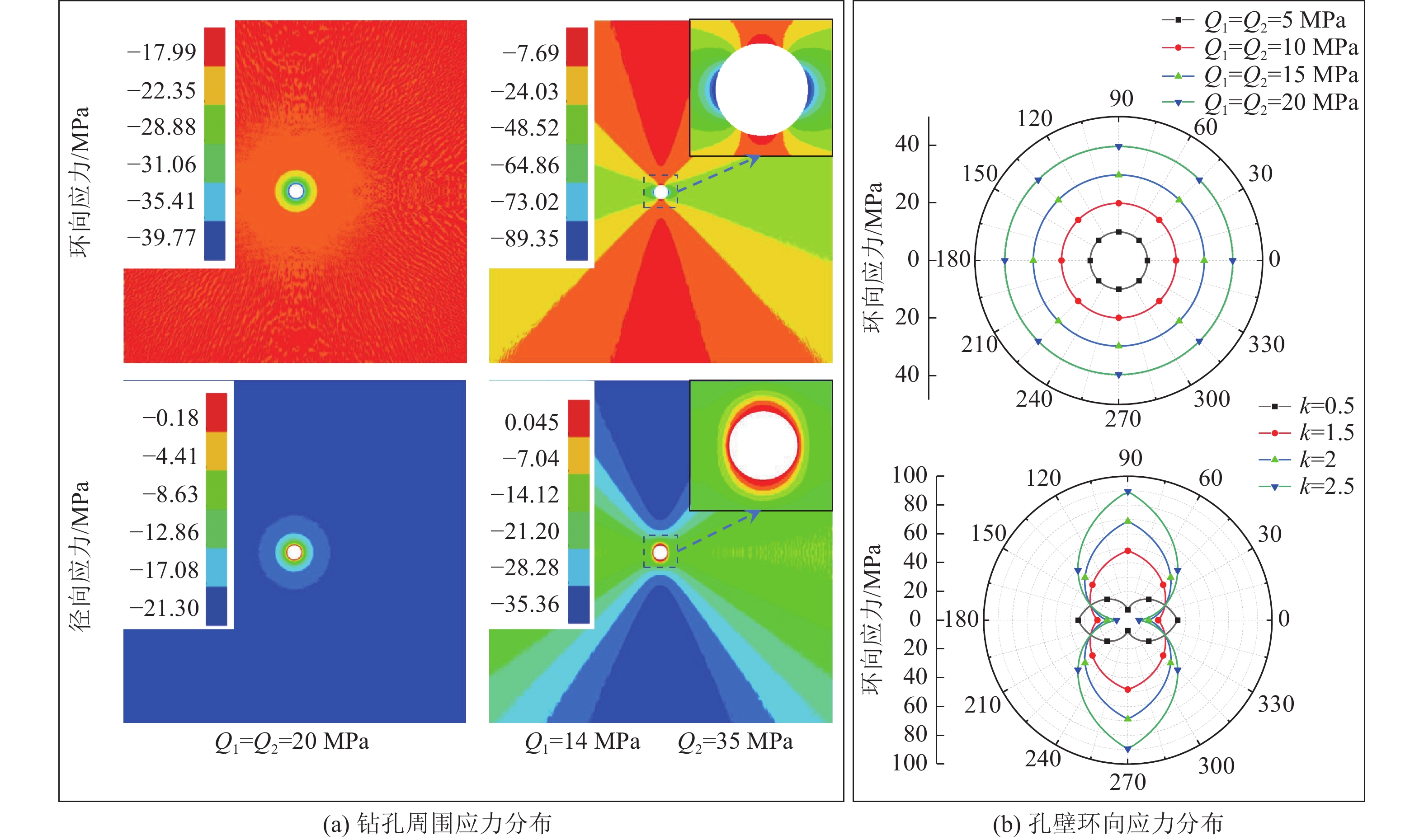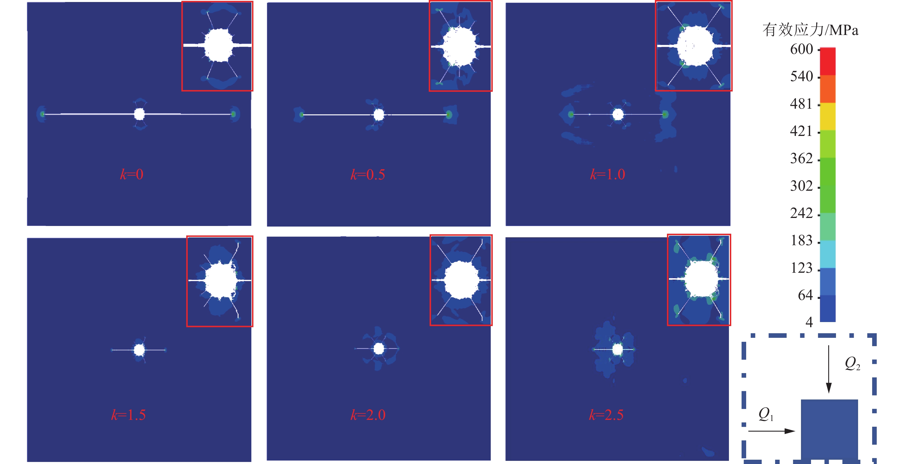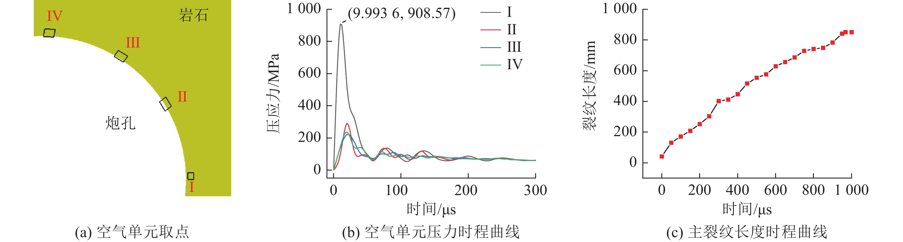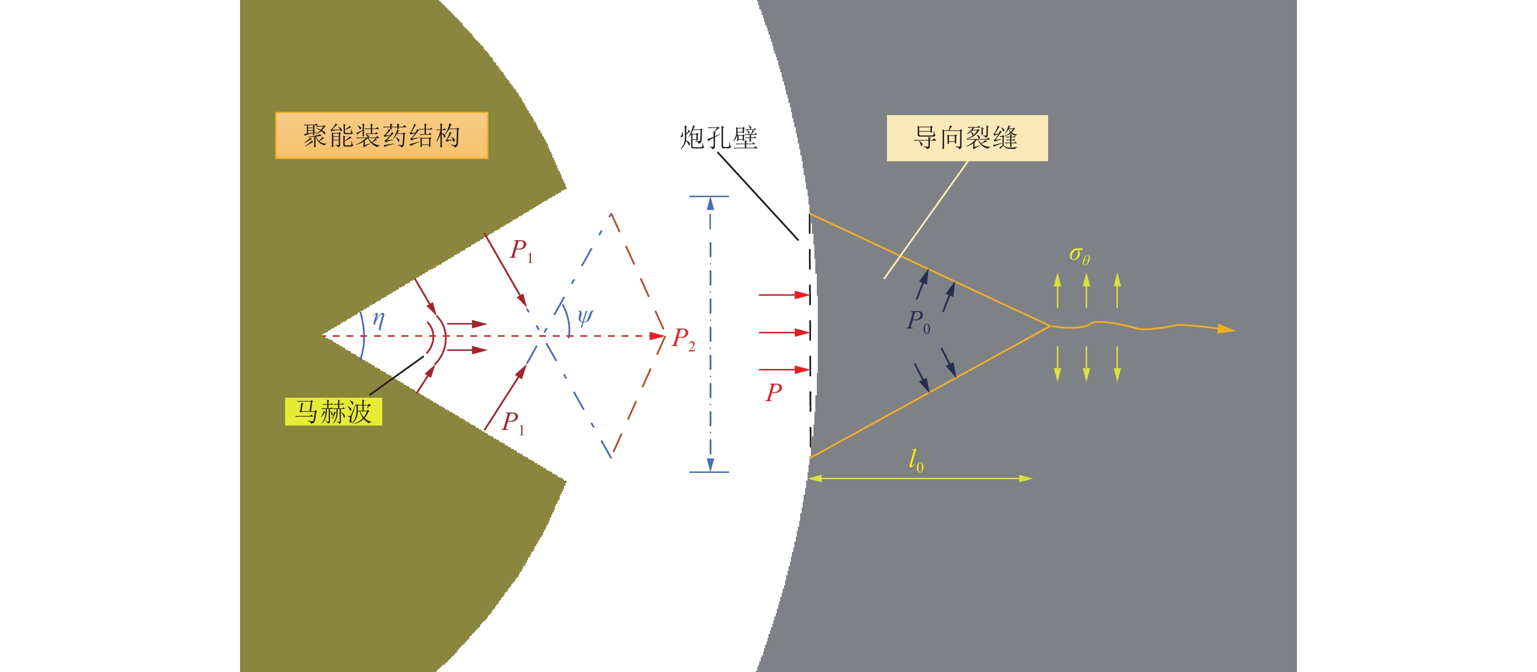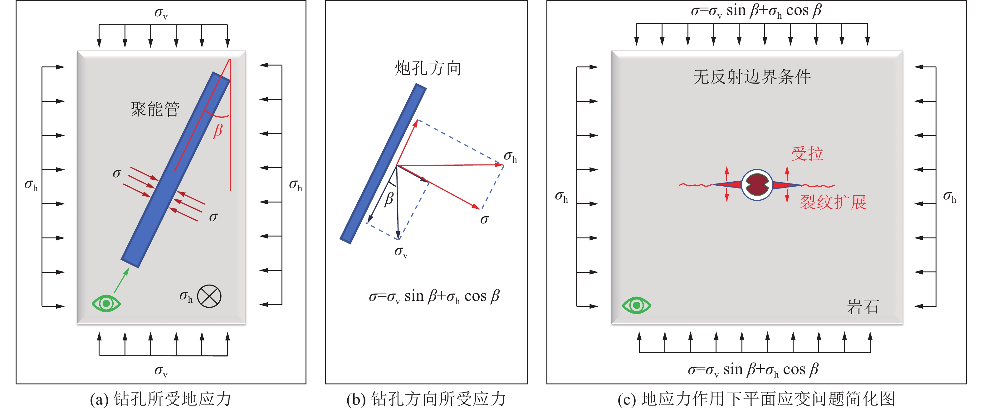 Deep hard rock blasting is a free surface blasting process under the coupling effect of explosive dynamic and static load and in-situ stress. In-situ stress has a strong inhibition effect on blasting crack propagation, which greatly limits the application of deep hole blasting in the engineering of hard rock pre-weakening and roof cutting and pressure relief. In order to clarify the action mechanism of stress wave and explosive gas on crack initiation and propagation in infinite rock blasting under the influence of in-situ stress, based on explosion mechanics and fracture mechanics, the length of guided crack in shaped charge blasting action was theoretically deduced. Combined with LS-DYNA software, the process of crack initiation and propagation in rock under dynamic and static action of shaped charge blasting with or without the influence of ground stress is simulated and analyzed visually. The results show that: 1) The numerical simulation results indicate that the time cut-off point of dynamic and static action is 32 μs, and the phase of shaped charge blasting action is dominant for crack initiation and initial propagation. The static action of explosive gas is the dominant factor for crack propagation. 2) When there is no in-situ stress, the crack propagation length in the phase of static action is 11 times longer than that in the phase of stress wave action. Compared with the condition without in-situ stress, when the in-situ stress is 20 MPa, the crack length in the action stage of shaped blasting is inhibited by 12.4%, and the crack length in the static action stage is inhibited by 86.3%. The in-situ stress mainly inhibits the crack growth in the static action stage of the later explosive gas. When the lateral stress is perpendicular to the direction of crack growth, the inhibitory effect decreases with the increase of the lateral stress. 3) Based on the background of roof cutting and pressure relief engineering of N1302 working face in Gucheng Mine, the crack propagation mechanism of in-situ stress and dynamic and static action of deep-hole blasting was considered through numerical simulation, and the optimal decoupling coefficient was finally determined to be 1.3, and the hole spacing was