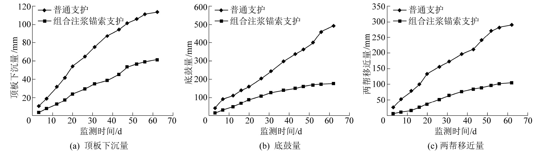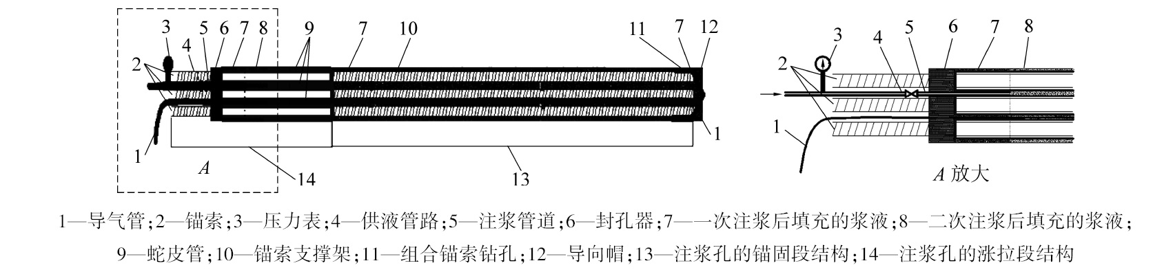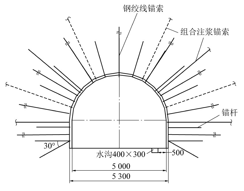 In onler to solve the problems commonly existed in deep roarlway with serious deformation,and difficultsupport of surroundingrock , etc., the deformation and failure chanacteristis of deep high stress roatway sumounding rock and its influencing factors were ana-lyzedl, and the mechanism of high strength boling support was discussed , the combined anchor cable grouting support technology and sup-porting costruction technology were studied , the combinel anchor cable high-pressure grouting technology scheme and process parameterswere designedl, and a new type of combined anchor cable grouting sealing device was designed.T'he results show that: the grouting of thecombined anchor cable can be divided into two parts :sealing grouting and hole sealing grouting. After the fist grouting, the owrifice is solid-ified and the grouting presure is significantly increased from 3 MPa to 8 MPa.After the grout pressure is increasedl, the grout diflusion ra-dius is obviously increased , the grout spreads along the cacks of the rock layer,which increases the ceohesion of the fractured rock strata ,and improves the overall strength of suroundling rocks , and forms a stable pressurized composite arch around the roadway, which will im-prove the stability of the roadway.'Tlhrough comparison and analysis, the control efect of the roadway surroundling rock in the combined an-chor cable grouting support section is significantly better than that of the ordtinary support section.The supporting strength of surroundingrock of roadway is greatly strengthened,and the integrity of surounding rock is improvel , the surounding rock of roadway defomation isredluced by more than 50% compared with the ordinary support section,and the surrounding rock deformation is better controlled.
