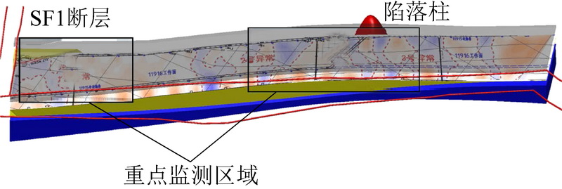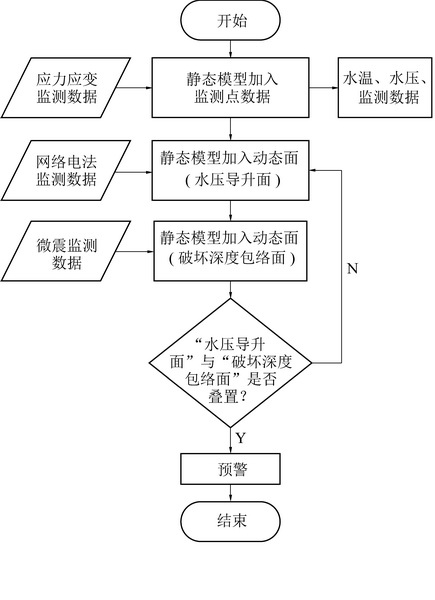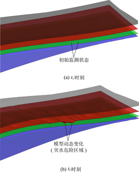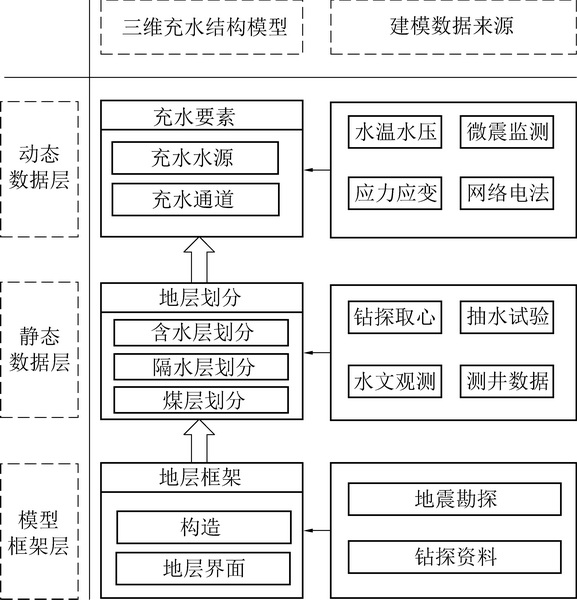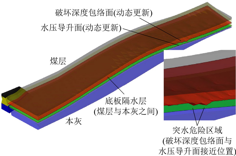 In order to obtain detailed dynamic changing information on both hydrogeological structure and water filling factors from a stope of mine, thus improve the monitoring and early warning technology against mine water disaster, a concept of visualizing 3D structure of water filling is proposed.This three-dimensional structure includes a static model and a dynamic visualization model with the static model being a model of real body, and the dynamic visualization model is a visualized model from embedding the static model with temporal and spatial change information of water filling source and water filling channel.The static model is constructed based on exploration data such as geological, geophysical, and hydrogeological on data using the open-source geometry kernel Open CASCADE combining DSI discrete smooth interpolation algorithm and Kriging interpolation algorithm.The static model is created to demonstrate the static characteristics of the hydrogeological structure in a stope scale.On another hand, the dynamic model relies on a range of dynamic information such as water pressure, water temperature, stress-strain, apparent resistivity and fracture range, to generate derivative dynamic data such as hydraulic lifting surface and the floor failure surface.In the dynamic model, above dynamic parameters are embedded with the static model to illustrate the changes in time and space for water source and channel.The maximum response time for data updating of the dynamic model should be 10~20 s.Based on the theory of “three zones under the bottom” of the floor, we propose a new technical idea to create a water inrush early warning criterion based on whether the “water pressure rising surface” and “floor failure surface” are overlapped.The dynamic model was tested in No.11916 working face of east shaft of Gequan Mine.After collecting geological, geophysical, hydrogeological and mining engineering information, and by integrating essential dynamic monitoring information of water filling such as sensors, network continuous electrical method and microseism, a three-dimensional water filling structure visualization model of the stope is constructed, which is applied to the comprehensive monitoring and early warning system of the floor water inrush, and provides a new technical platform for designing the monitoring system of floor water hazard and the intelligent early warning for No.11916 working face.