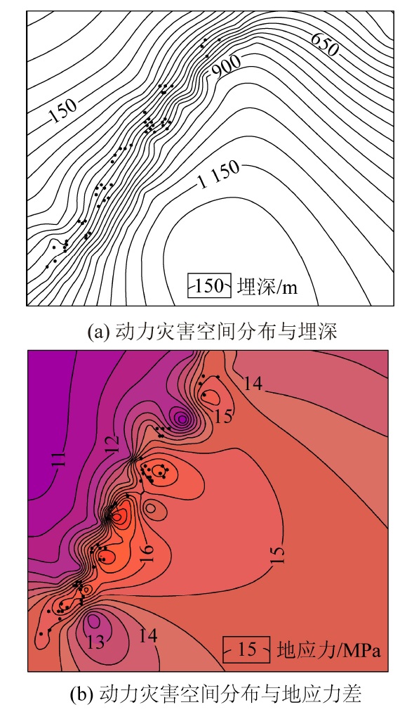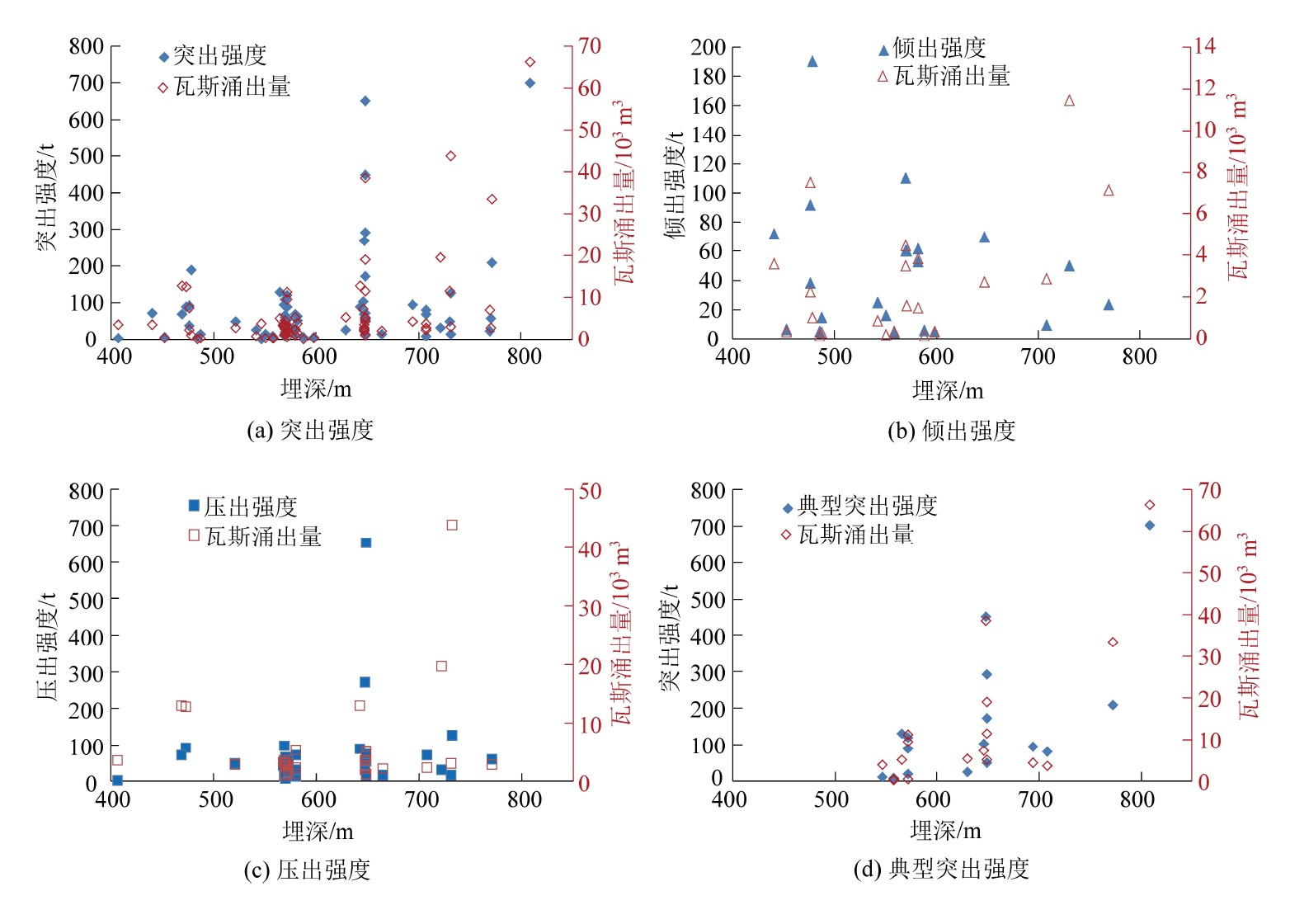 Aiming at the complex problems of the inducing mechanism and influencing factors of deep dynamic disasters, based on the dynamic disaster of Hongyang No. 2 Coal Mine, the spatial distribution of disasters was calculated, and similar simulation experiments of dynamic disasters under different parameter conditions were carried out to study the mechanism and influence of disaster inducing factor.The results show that: the dynamic disaster of Hongyang Coal Mine is mainly concentrated in the high stress and stress concentration area with obvious regional features. Compared with pour out and press out, the change rule of typical prominence is more obvious. The fitting empirical relations between outburst intensity, distance and relative outburst intensity, gas pressure and initial velocity of emission in Hongyang Coal Mine are obtained.With the increase of gas pressure dynamic disasters changed(pour out-delivery-typical outburst), the critical value of gas pressure needed for outburst can be reduced by the quick release of in-situ stress, the index(Δp) has a significant positive effect on the outburst intensity.Pour out and delivery can be treated as coal after certain damage accumulation stage, the one-time failure instability, the key to highlight the launch is typical has high potential of coal and has good moment release conditions, outstanding process can be regarded as typical coal mechanical instability and high potential to highlight sustainable development of coal.When the dynamic determination index Cm meet simultaneously, typical coal and gas outburst occurs. If Cm is not satisfied soft coal bodies with local development or stress concentration will suffer from dumping or compression disasters.