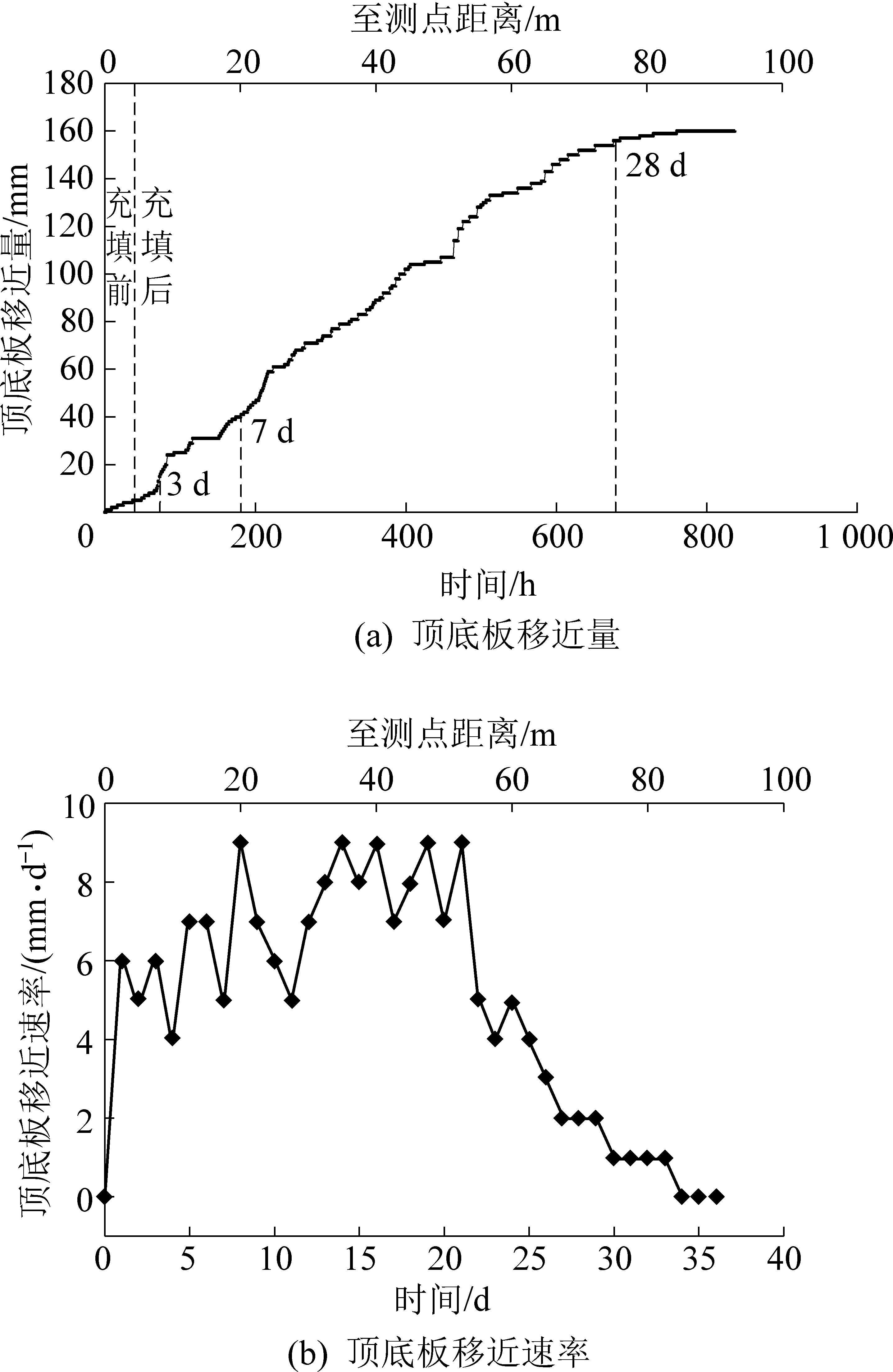 2)分析采集得到的顶底板移近量,得到充填体变形与顶底板移近规律;验证充填过程中充填步距、顶板支护强度等充填工艺参数的合理性;同时说明超高水材料充填体能够控制覆岩活动,能够实现绿色充填开采。