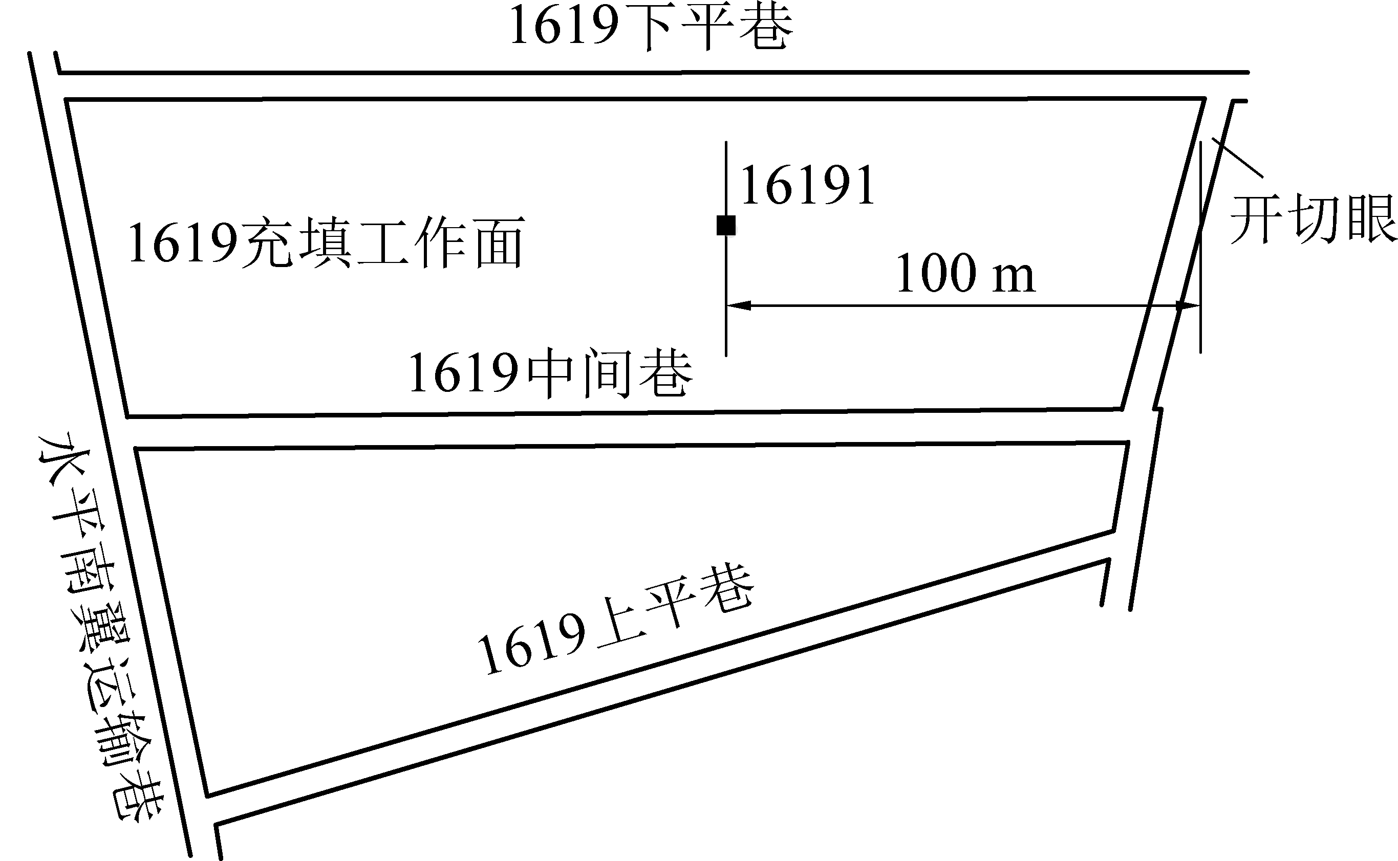 本次充填工作面为1619工作面,位于田庄煤矿工业广场南侧6~190 m,东西长约427 m,南北长约200 m,开采16上煤,16上煤平均煤厚约1.22 m,埋深约265 m,煤层倾角2°~6°,平均倾角4°。工作面整体布置方向为东西方向,布置方式为高档普采对拉工作面,3条巷道,上平巷兼顾回风及辅助轨道运输,下平巷兼顾回风及主要带式输送机运输,中间巷兼顾进风及主要辅助运输,工作面工业储量7.5万t。