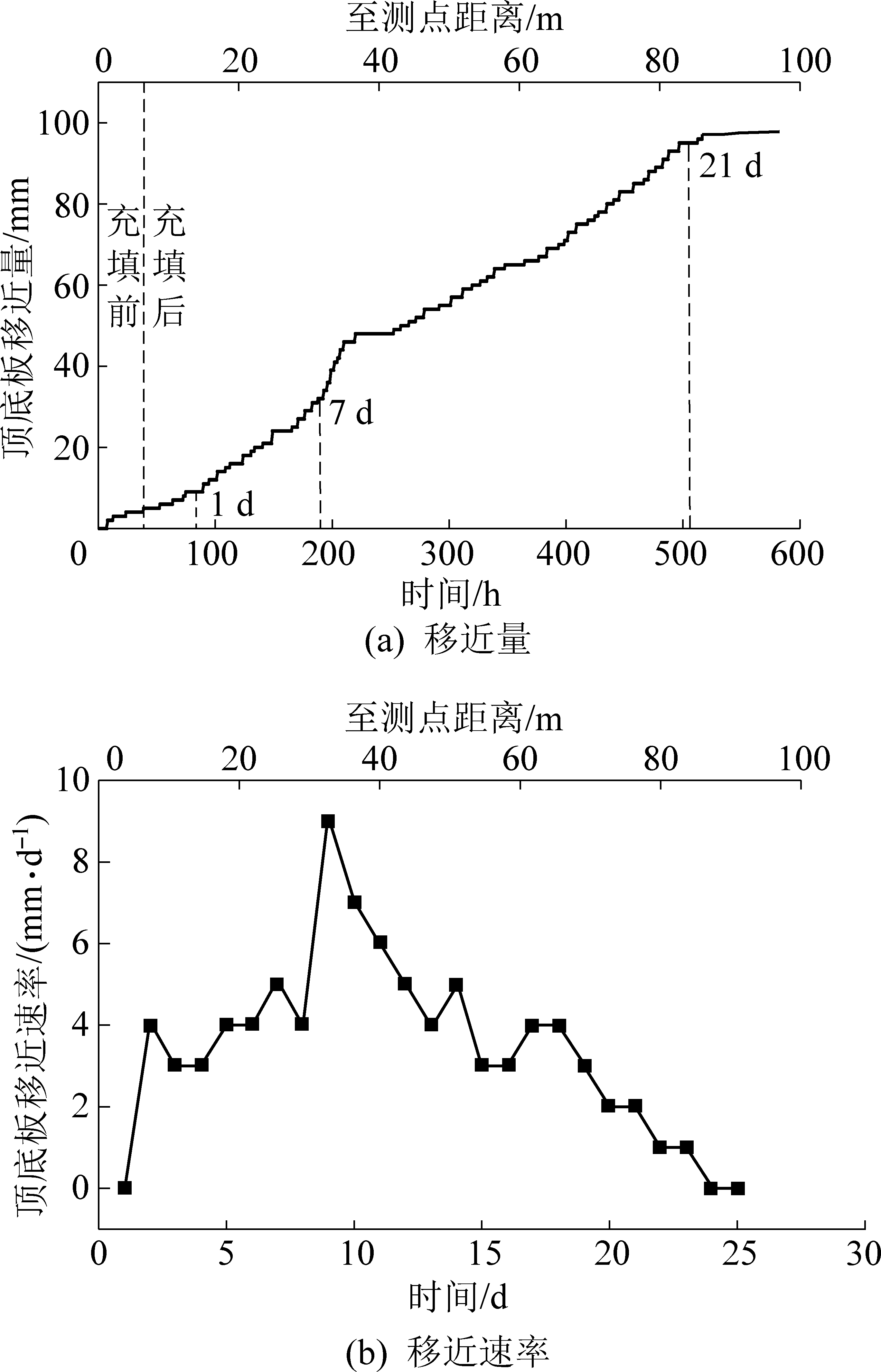 采空区充填后,顶底板移近量不断增加,移近速率较充填前也有所增加,但移近速率在充填体龄期7 d时达到峰值,之后移近速率基本保持稳定,说明充填体开始对顶板起到了一定的支撑作用,充填体强度和顶底板移近量呈线性关系。