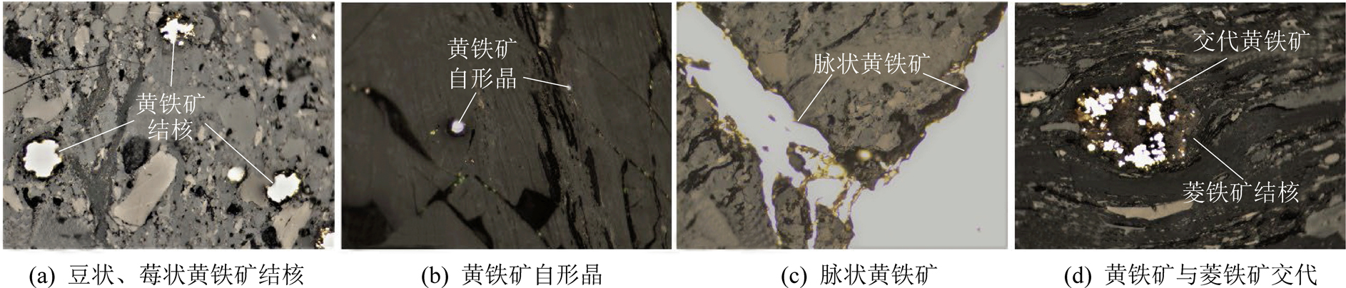 显微镜下,裂隙中脉状分布的黄铁矿是研究区煤中硫化铁存在的主要形式,其形态服从于裂隙的展布形态,说明这些脉状黄铁矿在形成时间上晚于煤层压实裂隙的产生。煤中大量的菱铁矿结核,其周缘和表面被黄铁矿交代共生,且菱铁矿外围的显微组分具有流动变形特征。这种显微组分、菱铁矿结核和黄铁矿交代证明了一个时空关系,即菱铁矿结核→有机质压实→黄铁矿交代。如果同生阶段具有富铁特征,则早期成岩阶段具有硫、铁同时富集的条件。