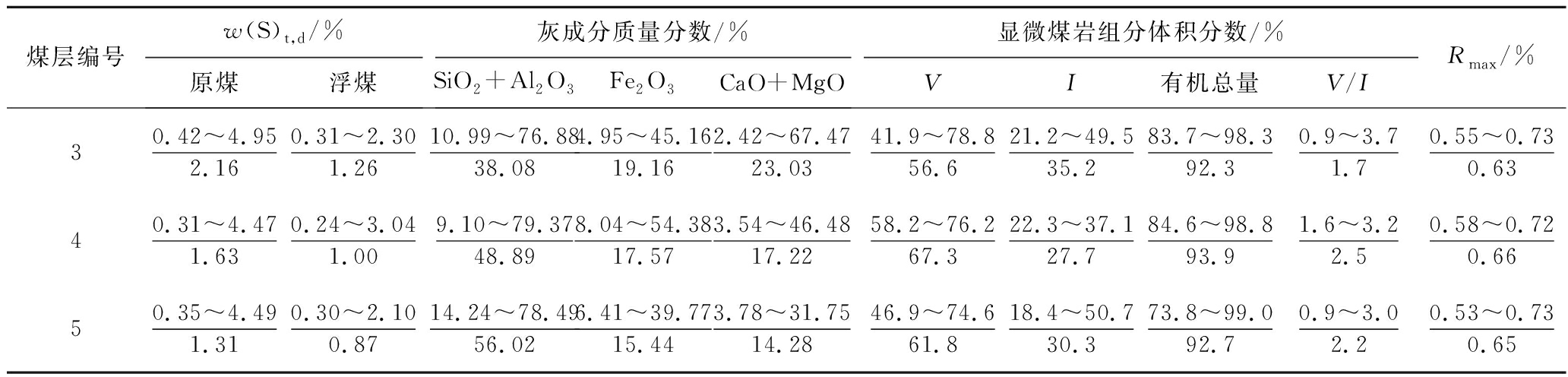 煤层编号w(S)t,d/%原煤浮煤灰成分质量分数/%SiO2+Al2O3Fe2O3CaO+MgO显微煤岩组分体积分数/%VI有机总量V/IRmax/%30.42~4.952.160.31~2.301.2610.99~76.8838.084.95~45.1619.162.42~67.4723.0341.9~78.856.621.2~49.535.283.7~98.392.30.9~3.71.70.55~0.730.6340.31~4.471.630.24~3.041.009.10~79.3748.898.04~54.3817.573.54~46.4817.2258.2~76.267.322.3~37.127.784.6~98.893.91.6~3.22.50.58~0.720.6650.35~4.491.310.30~2.100.8714.24~78.4956.026.41~39.7715.443.78~31.7514.2846.9~74.661.818.4~50.730.373.8~99.092.70.9~3.02.20.53~0.730.65