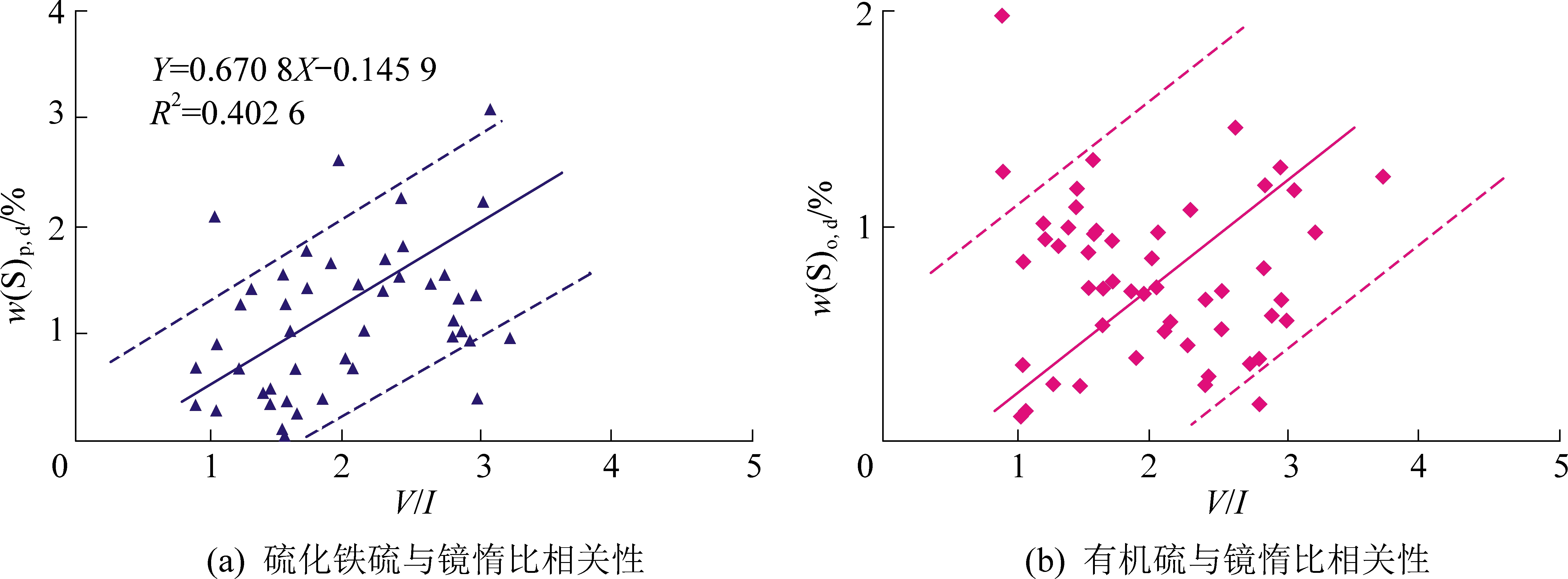 凝胶化作用是发生于成煤植物中的一个复杂的生物化学变化过程,可持续到成岩阶段。在这个过程中,煤中有机硫和无机硫的形成均有参与。煤岩学研究中一般将镜质组含量V或镜惰比V/I(镜质组含量/惰质组含量)作为表示泥炭沼泽凝胶化作用强弱的直接尺度。从硫化铁硫和有机硫含量与V/I关系来看(图7),虽然镜惰比与硫化铁硫和有机硫之间并非严格的线性相关,但在某一区间内硫化铁硫和有机硫都随着镜惰比呈正向变化,说明一定范围内(1<V/I<3.5)凝胶化作用有利用于硫的聚集。