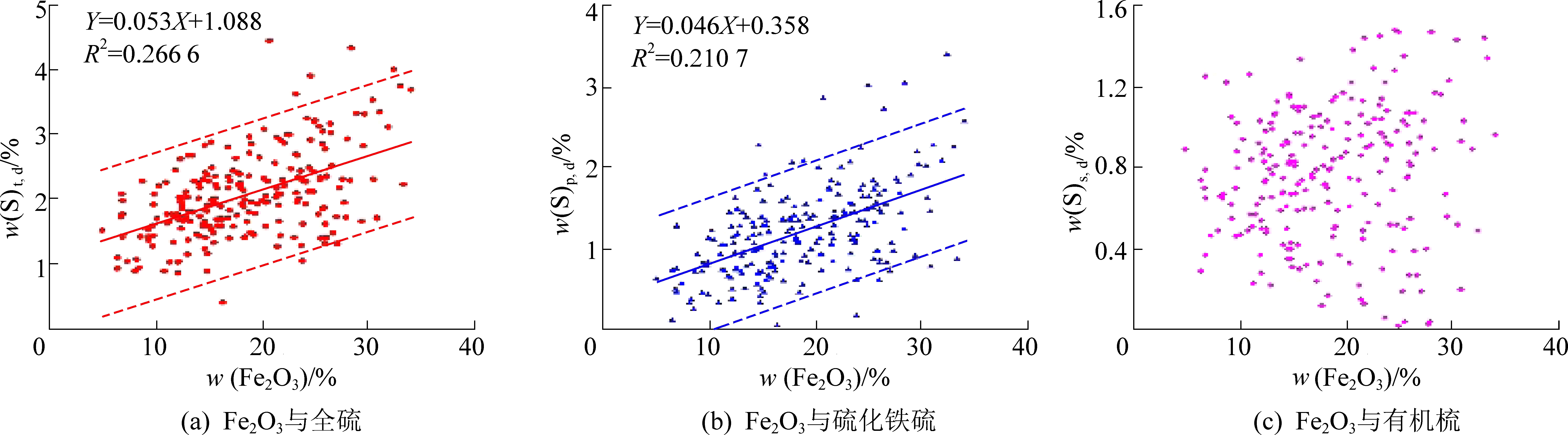 Fig.9 Correlation diagram between Fe2O3 content in ash and total sulfur,pyrite-sulfur and organic-sulfur