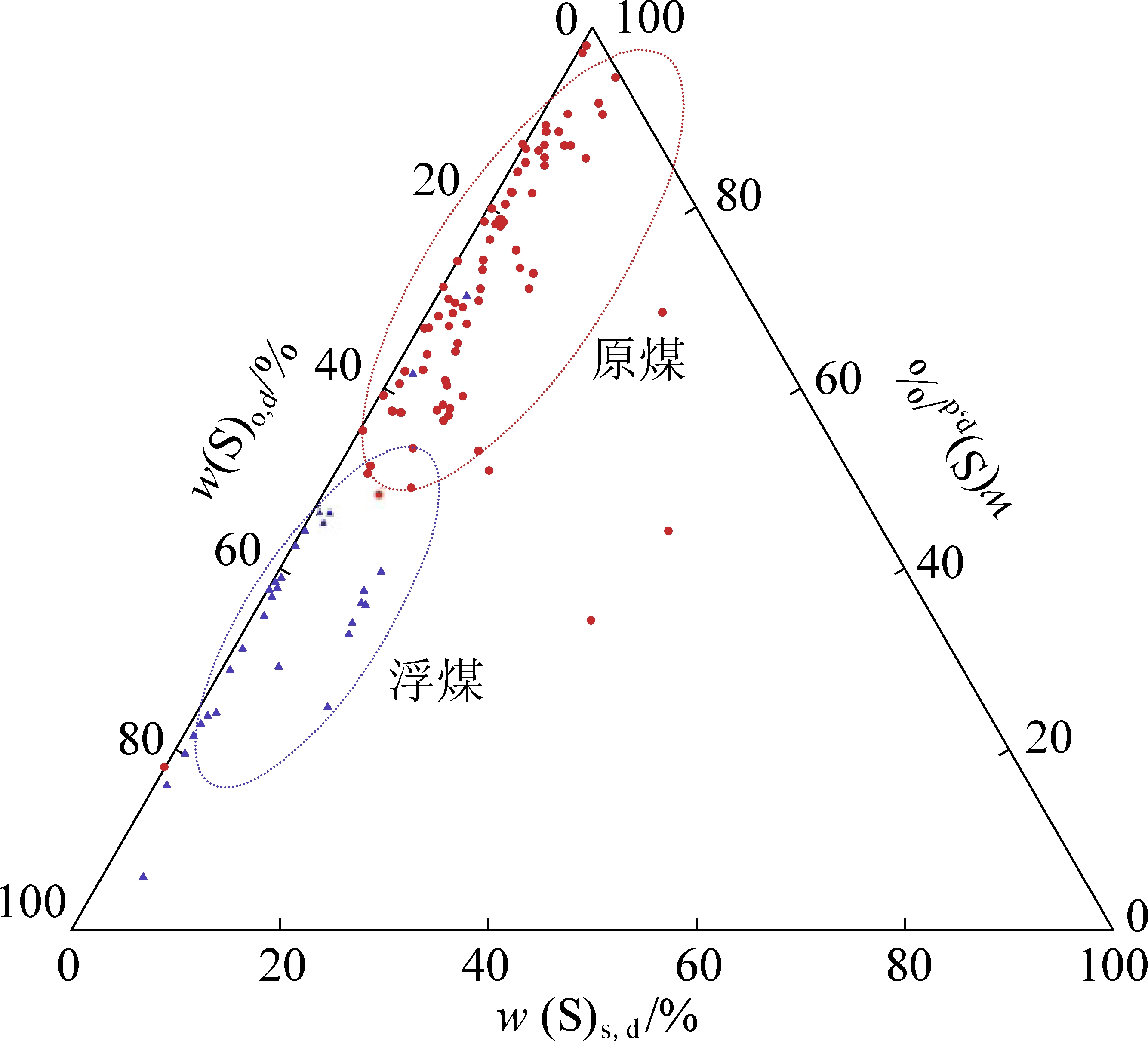 图5 中高硫煤和高硫煤各形态硫百分含量三角图