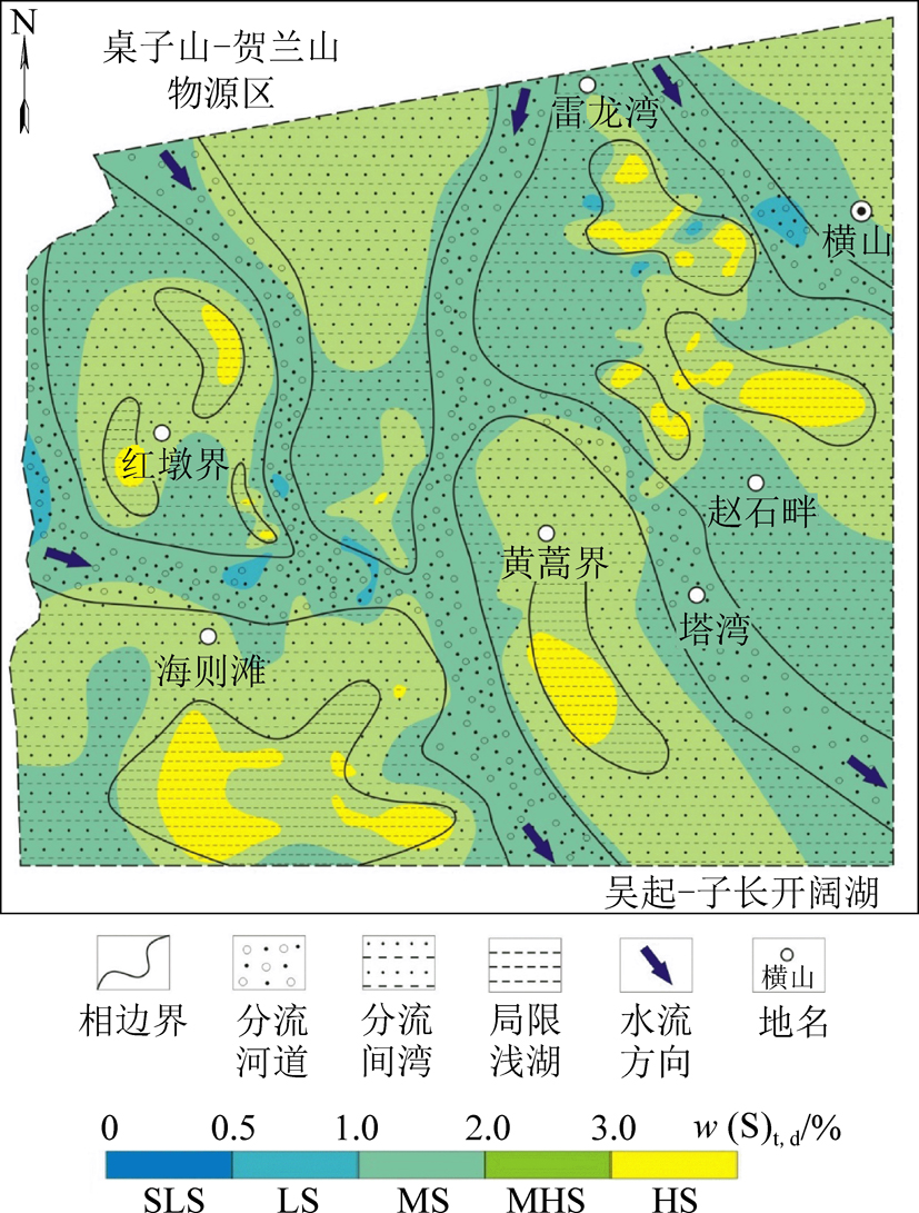 分流河道:在区内呈网状分布,其物源来自西北部,由西北向东南流经研究区后注入东南部的吴起—子长开阔湖。代表岩性为发育交错层理的灰白色长石石英中、粗粒砂岩,骨架砂体厚度在10~30 m。分流河道属于开放环境,水动力条件相对较强,硫酸盐随水流持续迁移,还原性较弱,Fe3+难以被还原为Fe2+,从而限制了FeS的形成,煤中硫含量相对较低。