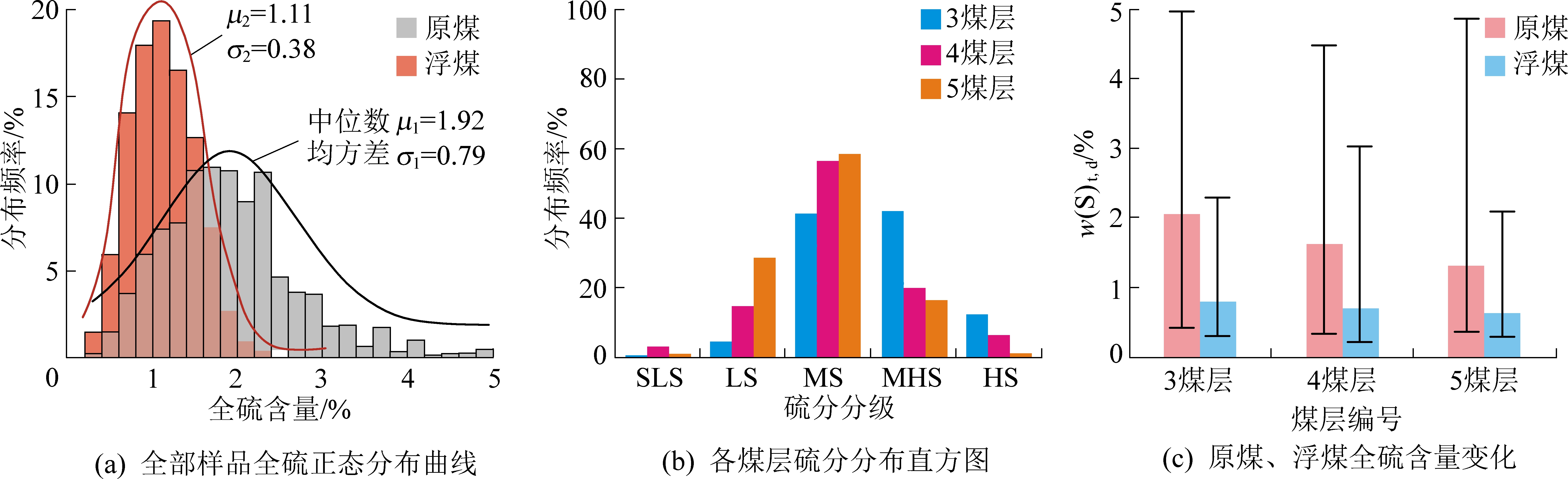 矿区内3、4、5煤层全部样品的原煤全硫含量变化范围在0.31%~4.95%,平均值为1.83%,与邻近的榆横矿区北区和榆神矿区存在明显差异(表2),平均值远高于全国早、中侏罗纪煤中硫含量的平均值0.58%[5],亦高于榆横地区延安组煤中硫含量的平均值1.12%[19]。分布特征为负偏态,中位数为1.73%,标准方差为0.79,全硫含量集中分布在0.8%~2.4%,以中硫煤和中高硫煤为主(图2a)。