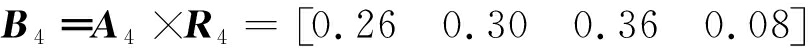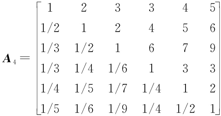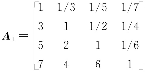 由式(6)、式(7)得CR=0.08<0.1,经判断矩阵的一致性检验可知,A4具有满意的一致性。