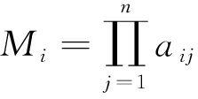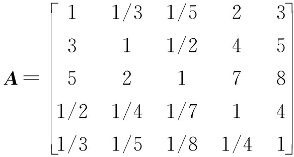其中:aij=1/aji。判断矩阵A中的元素aij表示要素ai对aj的相对重要度,即
