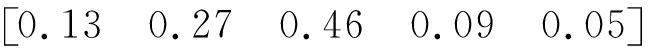 2)经式(2)—式(5)计算,判断矩阵的最大特征值为λmax=5.21,评价因素的权重为