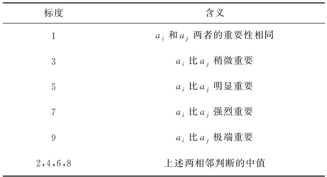 其中:wi和wj分别为要素ai和aj的重要性标度值。判断矩阵主要是通过1~9标度方法来量化要素重要性[22-23](表1)。