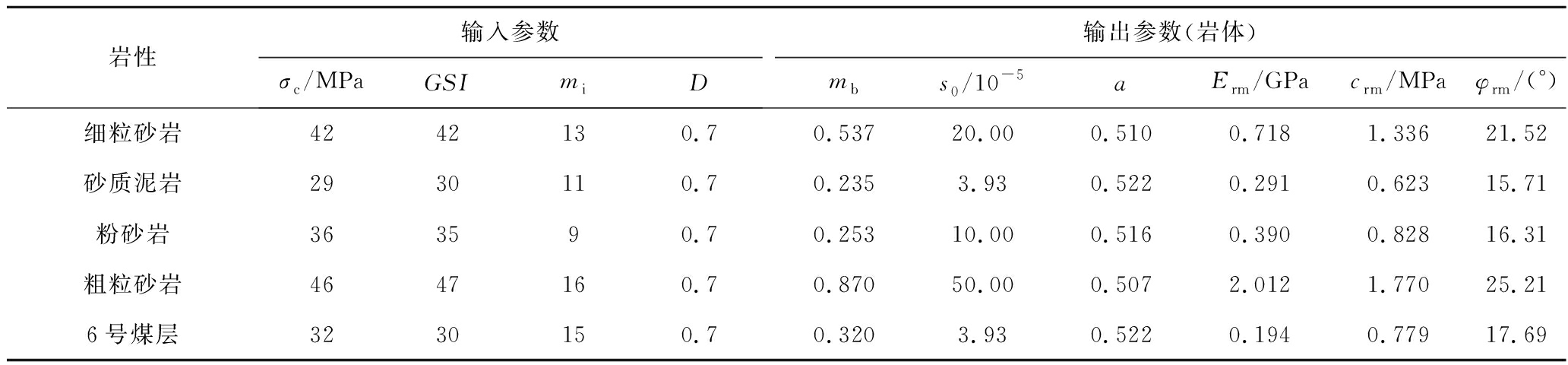 2)参数确定过程。对纳林庙煤矿6号煤层顶底板岩层进行现场取样并开展实验室试验,获得各类岩体标准煤岩样的力学指标,见表1。根据纳林庙煤矿钻孔岩心取样成果,结合GSI岩体强度指标体系[19]和表1数据结果,确定岩体的地质强度指标GSI,反映完整岩石软硬程度的参数 mi,岩体的受扰动程度参数D(0≤D≤1) [18]。通过计算得到各类岩体的力学参数,见表2。对比表1与表2可知,采用Hoek-Brown准则确定岩体强度参数的方法考虑了岩体结构面及赋存等相关地质因素,应用更加科学。