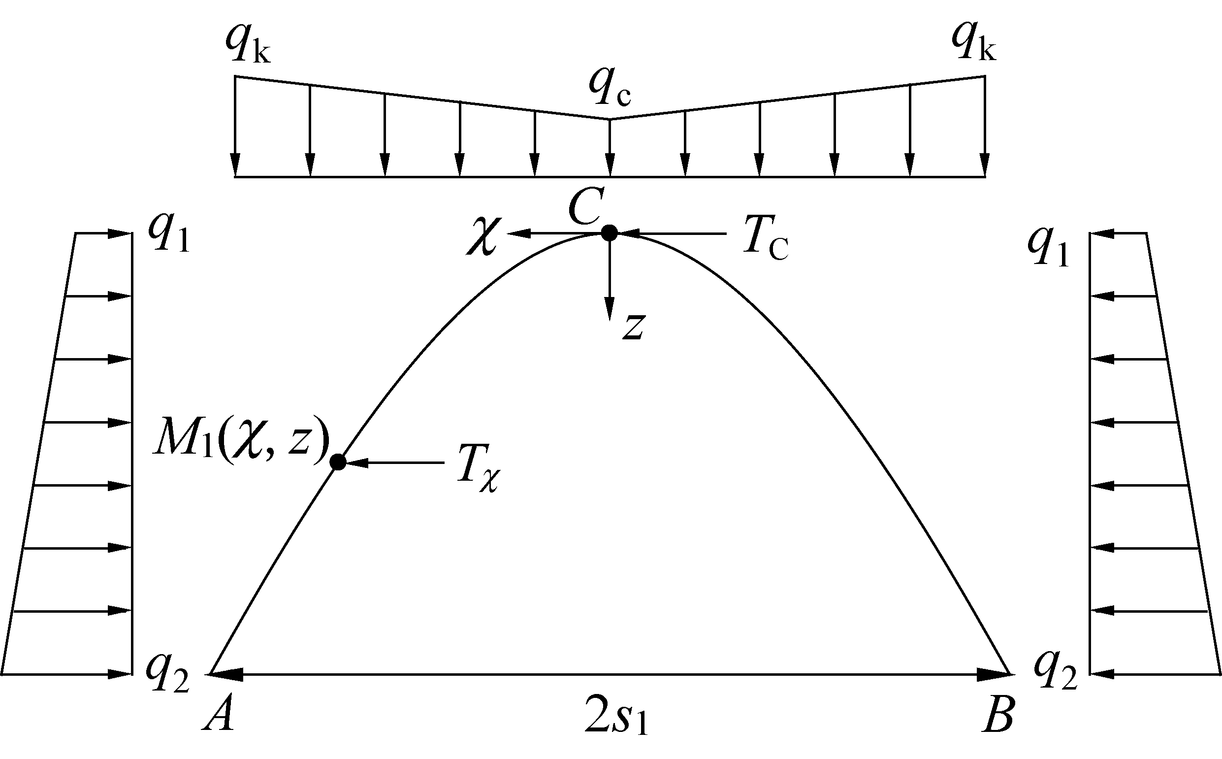 水平受力;q2—拱底水平受力;TC—拱顶C处的轴向力;