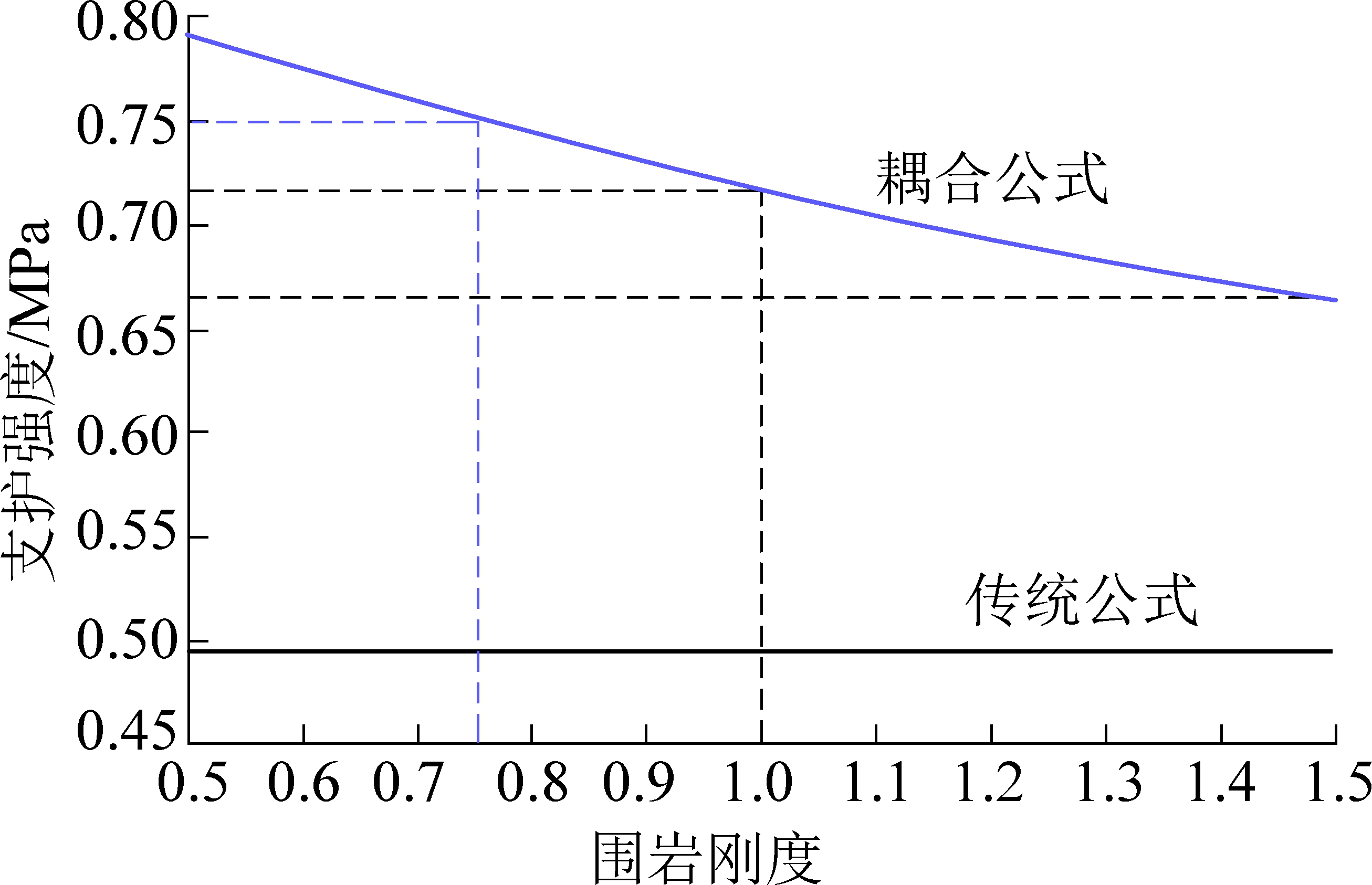 由液压支架与围岩刚度耦合公式可知[14],液压支架支护强度不仅取决于顶板岩性、采高和支架刚度,还与工作面煤层条件息息相关。将相关参数代入计算得液压支架所需支护强度如图9所示。由图可知,传统计算结果为0.5 MPa,而基于刚度耦合公式计算结果为支护强度应不低于0.67 MPa。研究表明,液压支架垂向刚度与其支护强度正相关[15],为了解决薄煤层液压支架调高幅度有限的问题,减少顶板下沉,需要开发大工作阻力、高刚度薄煤层支架。综合分析,选用ZY9000/088/16型液压支架,支护强度0.73~0.82 MPa。