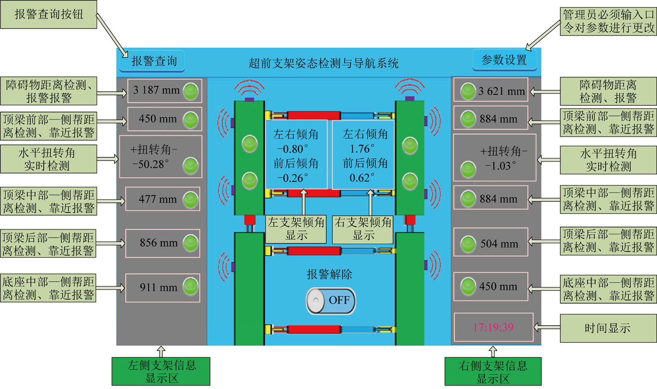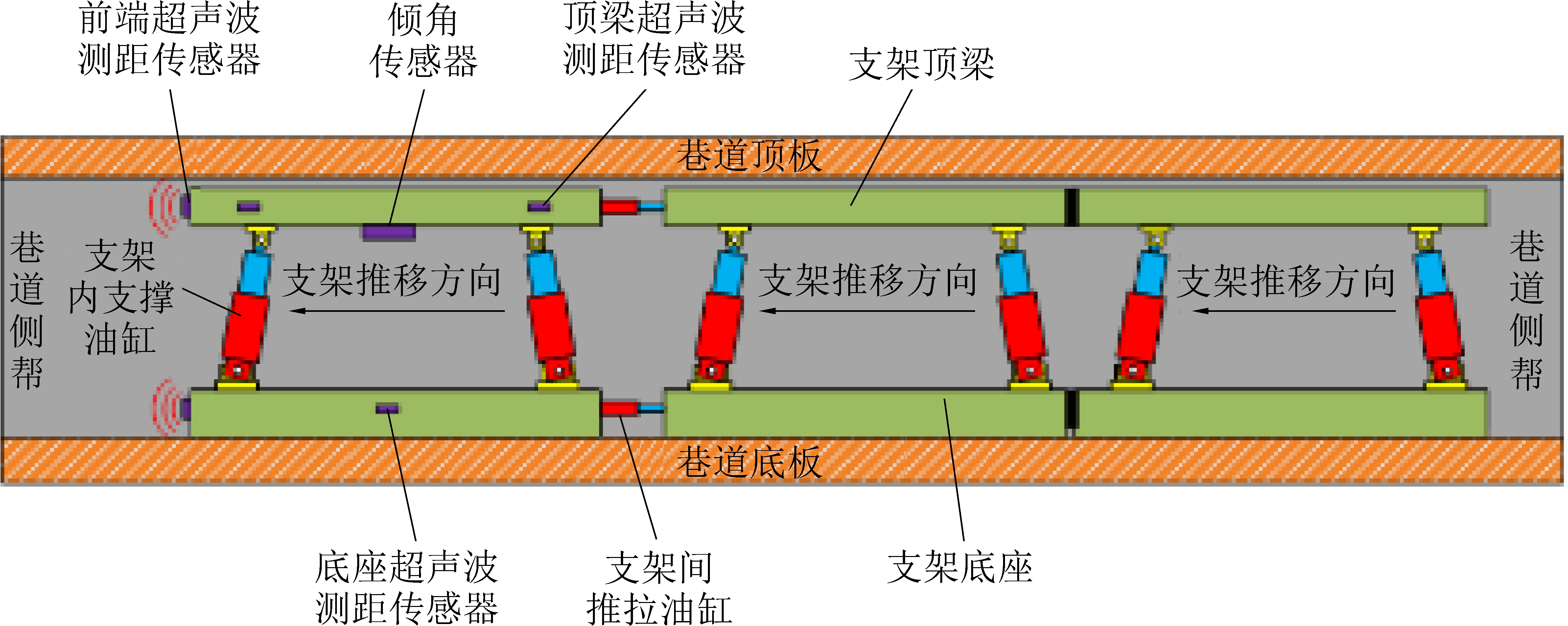 为了解决超前支架智能行走难题,如图5所示,在超前支架的顶梁前端和侧面、底座两侧设置超声波传感器,以感知超前支架到两侧巷帮的距离。在顶梁、掩护梁、前连杆、底座上布置双轴倾角传感器,以感知超前支架姿态,实时获取超前支架压力、倾角、航偏角、位移和支撑高度等关键参数,利用位姿检测系统以感知超前支架的支护状态(图6)。基于simulink模型的超前支架纠偏控制系统,实现超前支架行走状态的智能感知与控制。该装置在黄陵一号矿进行了井下工业性试验(图7),实现超前支架无人调整智能移架。