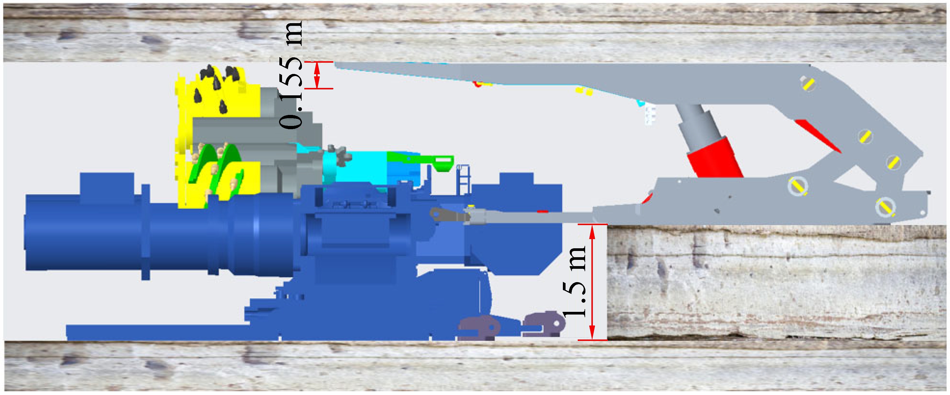 为了解决薄煤层设备破煤难题,研发了MG450/1 050-WD薄煤层滚筒式采煤机,装机功率1 050 kW,有效提高破煤效果。如图13所示,采煤机采用半悬机身设置,刮板输送机上方仅保留采煤机电机高度,传动部都位于煤壁侧,最大限度压缩机身高度,同时加大过煤空间,配套SGZ800/3×400刮板输送机,机面高度只有739 mm,过煤高度273 mm,1.1 m最小采高安全过机空间155 mm,有效地满足1.1 m最小采高安全支护需要。