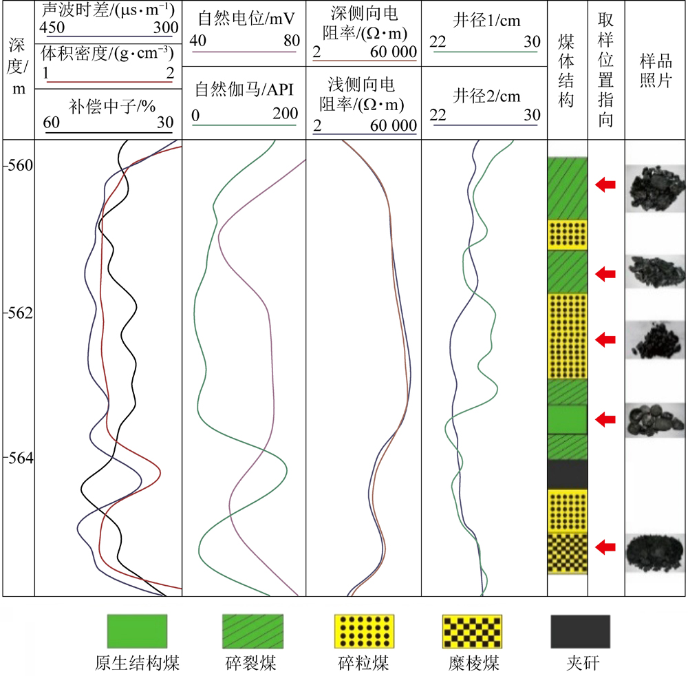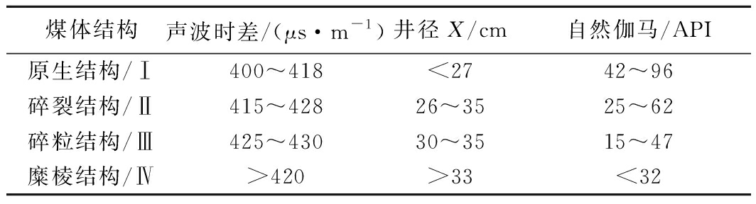煤体结构声波时差/(μs·m-1)井径X/cm自然伽马/API原生结构/Ⅰ400~418<2742~96碎裂结构/Ⅱ415~42826~3525~62碎粒结构/Ⅲ425~43030~3515~47糜棱结构/Ⅳ>420>33<32