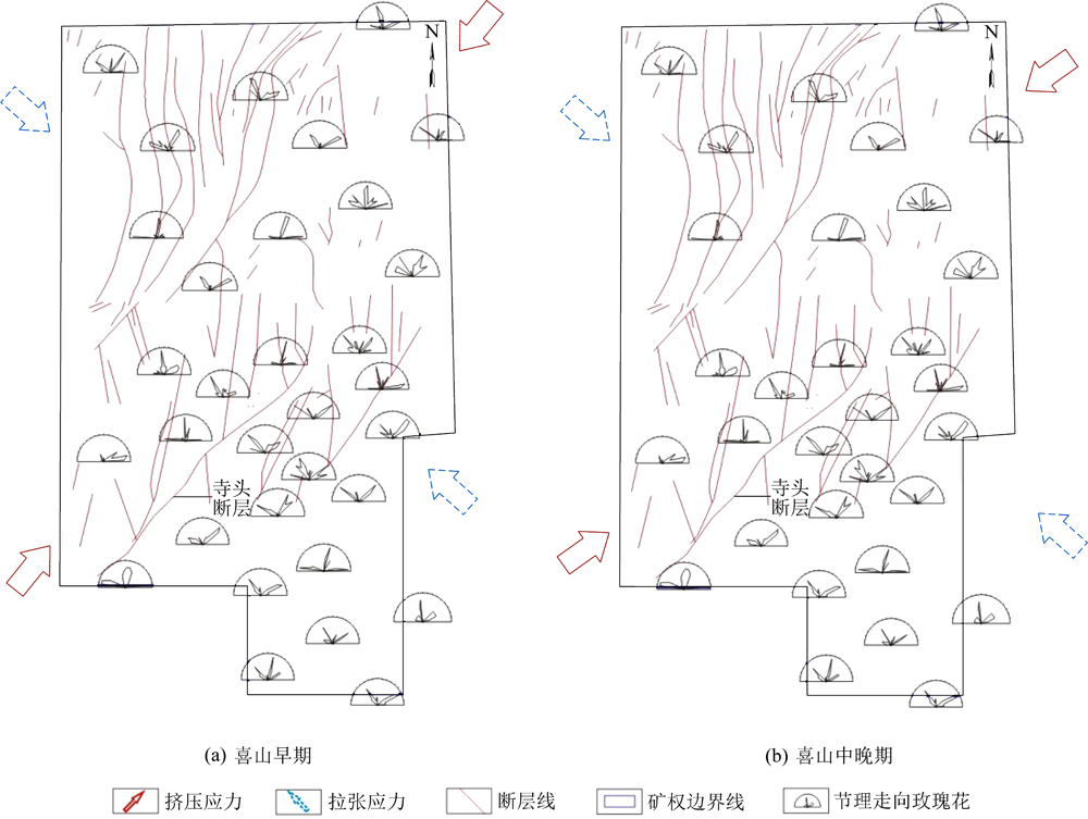 通过对野外节理(裂缝)数据的分析(图2和图3),并结合前人对沁水盆地南部的构造演化的研究成果,发现柿庄区块3号煤层形成后经受了四期构造应力场的改造(图4与图5),分别为印支期近NS向的挤压应力、燕山期NWW—SEE向的挤压应力、喜山早期NEE—SWW向挤压应力以及喜山晚期NE—SW向挤压应力[16-20]。其中印支期近南北向的水平挤压应力场对沁水盆地的影响并不大,沁水盆地仍保持了稳定状态,并未在盆地内部形成明显的地质构造,仅使盆地南部产生了一定程度的隆起抬升[16-17];燕山期是沁水盆地中生代以来最强烈的一次构造变形,在该期构造应力场的作用下,柿庄区块以挤压抬升和褶皱作用为主,形成了一系列轴向NE—NNE的宽缓的背、向斜构造和走向NW与近EW的节理[17、19];喜山早期受到NWW—SEE向的拉伸应力,燕山期形成的褶皱进一步的改造,底板形态更加复杂,并形成一些走向NNE或NE的正断层[17-19];在喜山晚期构造应力场作用下,导致盆地地壳进一步被抬升,接受剥蚀,并在第四纪老黄土中发育有节理构造[17-18]。