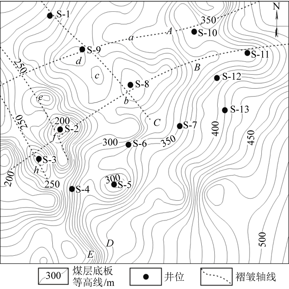 然后利用当前煤层底板标高及其波动值,求出关键点不同构造时期的煤层底板标高,通过插值法确定关键点之间的煤层底板标高,如此可以反演出关键时期的煤层底板标高,进而得到燕山期末构造形迹特征如图8所示。