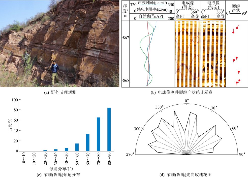 为全面反映节理发育情况,对柿庄区块内出露的上石盒子组和石千峰组地层的节理进行了观测和统计(图2a)。由于野外节理观测严格受限于地层的出露情况和地形地貌特征,因此节理观测点的区域分布具有不均一性和聚集性。为弥补野外节理观测不足,对柿庄区块具有电成像测井的钻井,进行测井天然裂缝产状统计(图2b)。综合野外节理和测井天然裂缝的产状统计,绘制了柿庄区块节理(天然裂缝)走向玫瑰花图(图2d)。统计结果表明,柿庄区块野外露头节理走向发育具有五个优势方向,其产状分别为NNE向(10°~25°)、NEE向(45°~85°)、NWW向(85°~110°)、NW向(135°~145°)、NNW向(160°~175°)。节理(裂缝)的倾角较大(图2c),主要分布在50°~ 90°,其中倾角大于50°的占93%,倾角大于70°的占76%,表明,柿庄区块主要以高角度、近似垂直的裂隙为主。