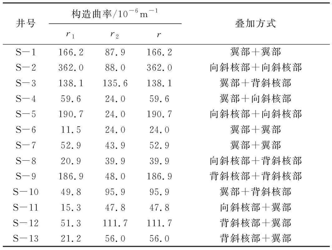 井号构造曲率/10-6m-1r1r2r叠加方式S-1166.287.9166.2翼部+翼部S-2362.088.0362.0向斜核部+向斜核部S-3138.1135.6138.1翼部+背斜核部S-459.624.059.6翼部+向斜核部S-5190.724.0190.7向斜核部+向斜核部S-611.524.024.0翼部+翼部S-752.943.952.9翼部+翼部S-820.939.939.9向斜核部+背斜核部S-9186.948.0186.9背斜核部+背斜核部S-1049.895.995.9翼部+背斜核部S-1115.347.847.8向斜核部+翼部S-1251.3111.7111.7背斜核部+翼部S-1321.256.056.0背斜核部+翼部