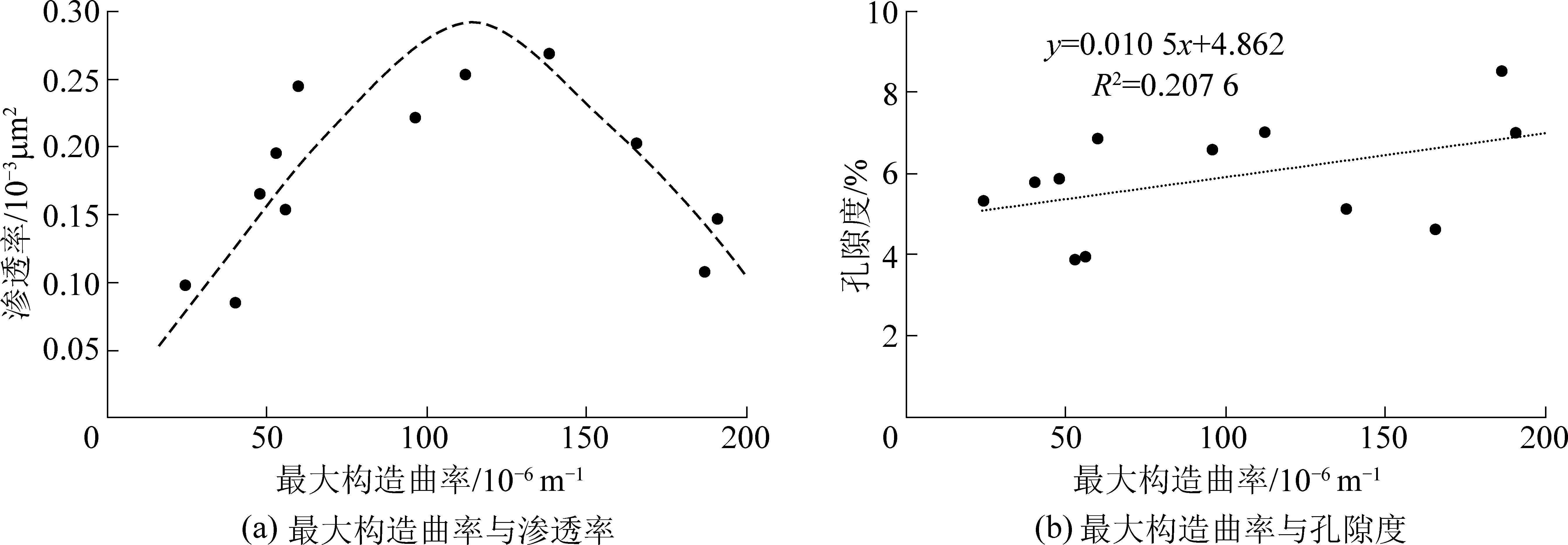 4)随着地史最大变形程度的增加,渗透率呈先增大后减小的趋势,其极值点在r=110×10-6 m-1附近,煤层变形程度对孔隙度的影响不显著。