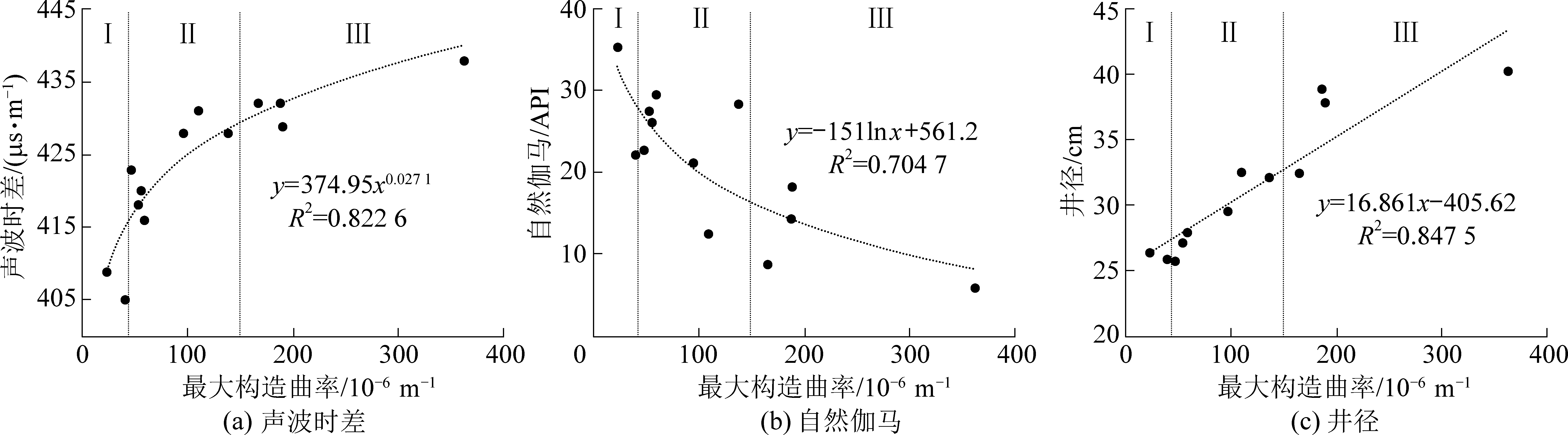 通过测井曲线与地史最大构造曲率的相关性分析可知(图10),随着煤体变形程度的增加,煤体结构的破碎程度也增大。由对应关系可知,当r<48×10-6 m-1时,为原生结构煤(Ⅰ类煤);当48×10-6 m-1<r<150×10-6 m-1,为碎裂结构煤(Ⅱ类煤);当r>150×10-6 m-1时,为碎粒结构煤(Ⅲ类煤)。柿庄区块糜棱结构煤基本不发育,但是对于煤体结构比较破碎的井,在破碎层段夹有少量的糜棱煤。利用地史最大构造曲率对煤体结构的预测,对于没有钻井的区域具有重要的现实意义。