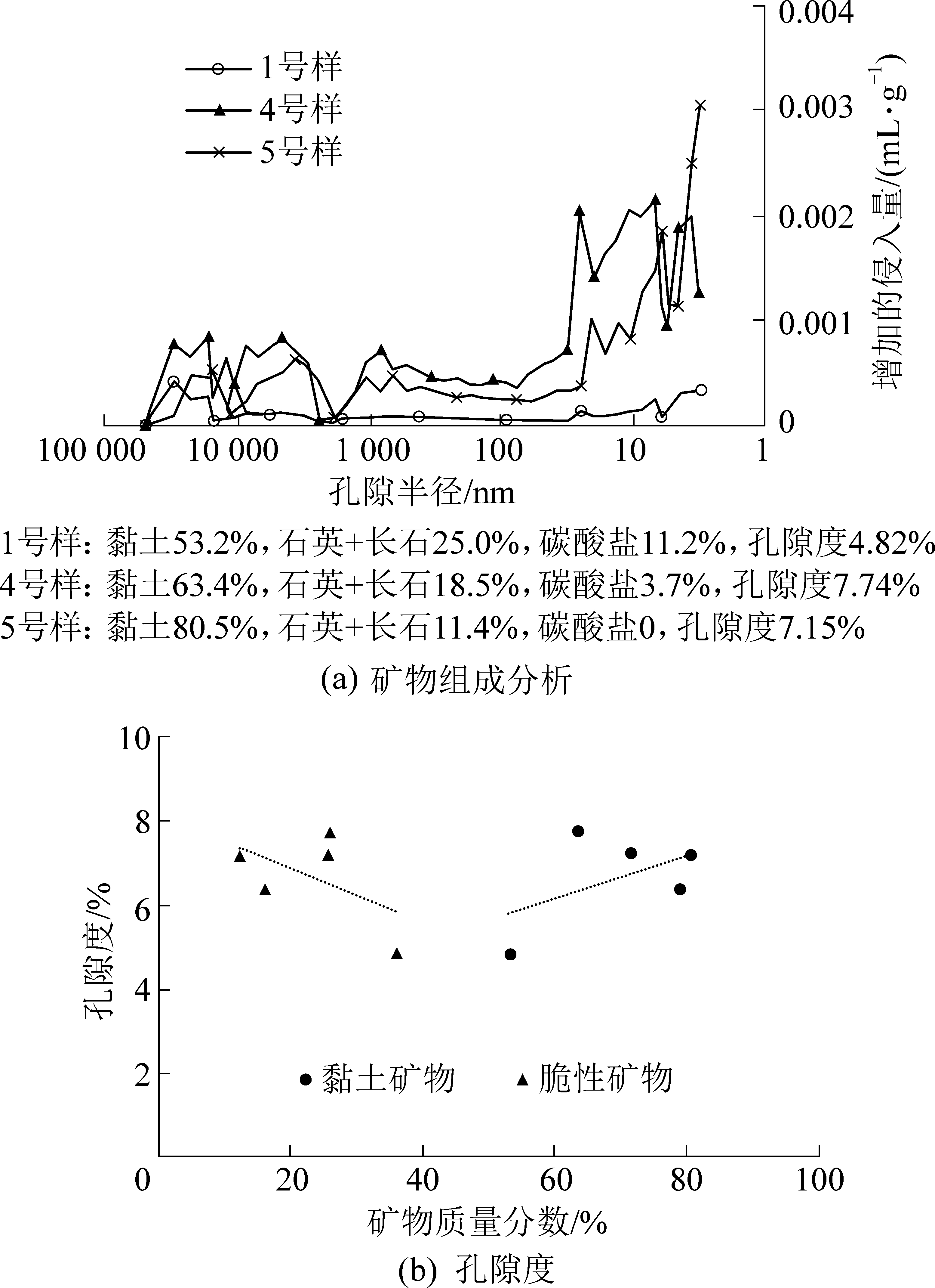 页岩中的孔隙由有机质微孔隙和无机矿物孔隙组成[12],黏土和脆性矿物组成对孔隙产生影响。根据压汞与矿物组分分析,黏土质量分数相对高的4号、5号样在不同孔径范围内汞的增加侵入量普遍大于黏土质量分数较低的1号样,增量峰值处于孔径<50 nm的部分;孔隙度与黏土质量分数呈正相关关系,随着石英、碳酸盐岩等脆性矿物质量分数的增加而减小(图6)。
