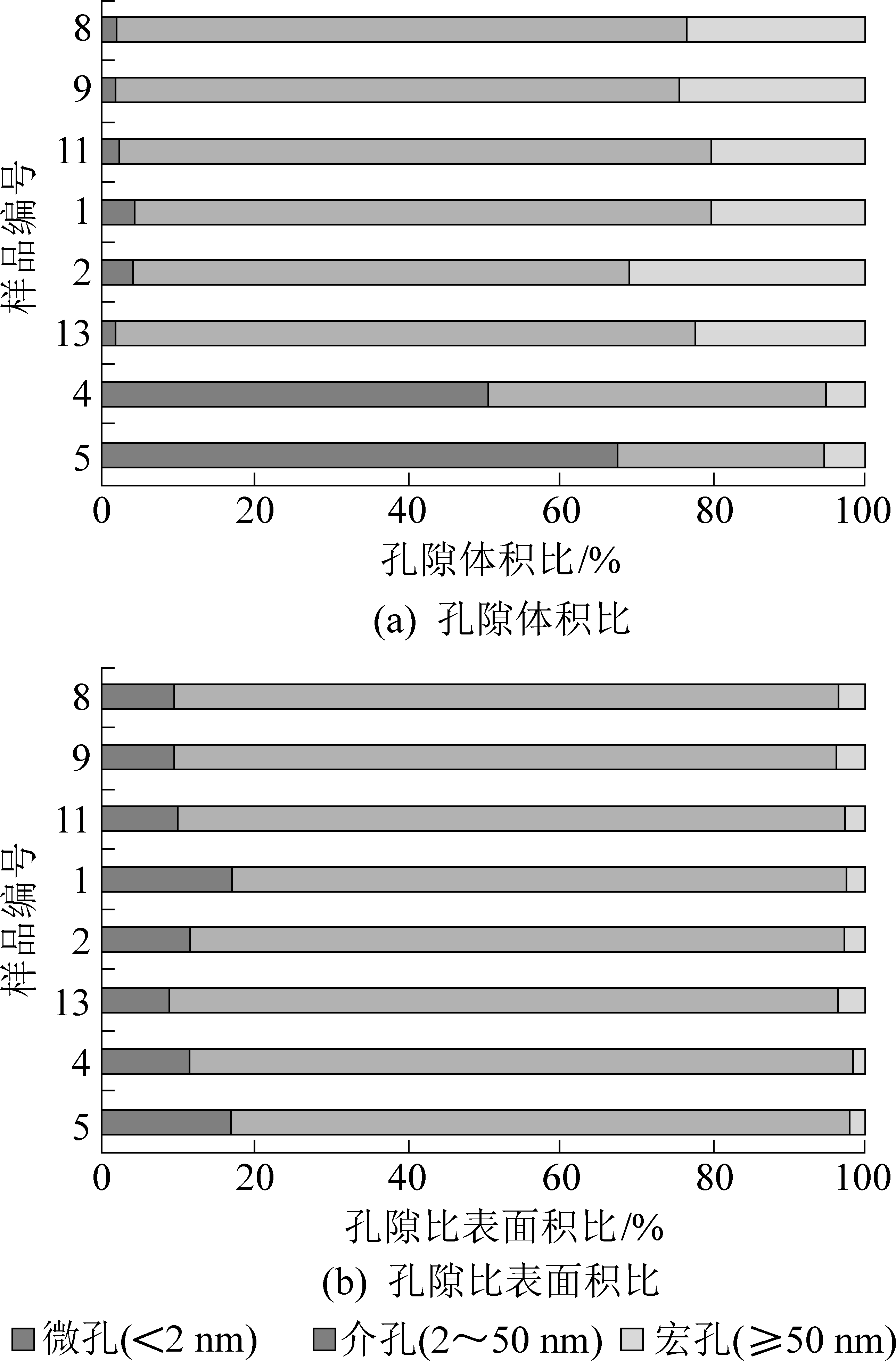 根据国际应用和理论化学联合组织孔隙划分类型(微孔<2 nm、介孔2~50 nm、宏孔≥50 nm)[13],孔径分布及比表面积测试结果显示(图5):泥页岩孔隙中介孔在总孔隙中占据比例平均超过65%;总孔容平均0.026 95 cm3/g,其中微孔的孔容平均0.011 66 cm3/g,孔表面积平均1.542 74 m2/g;介孔孔容平均0.019 88 cm3/g,孔表面积平均10.861 31 m2/g;宏孔的孔容平均0.005 09 cm3/g,孔表面积平均0.343 84 m2/g。泥页岩中介孔在孔容和孔比表面积方面占据主要地位,为页岩气储集提供了有利的条件。