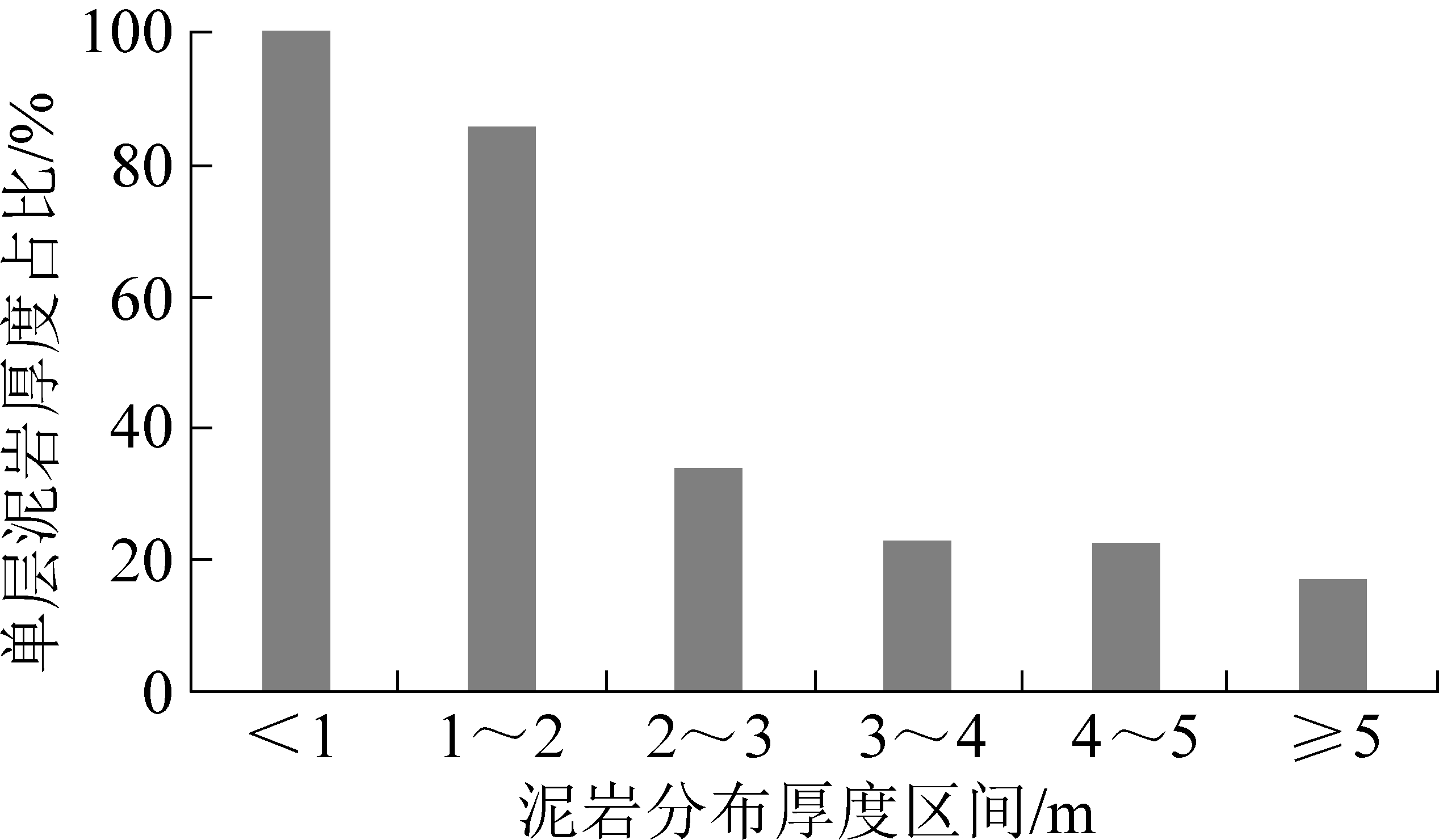 黔西毕节大方地区在区域上属于黔中隆起,自寒武世晚期开始至二叠世无造山运动[4,11],基本处于稳定构造环境,断层、褶皱发育。研究区所处的大方背斜定型于燕山运动,总体为北北东向褶皱。区内地层沉积主要受频繁的海进、海退影响,从中奥陶世至中晚石炭世隆起为陆导致地层缺失沉积,晚古生代晚期至中生代早期接受沉积后,中生代晚期的白垩纪、新近纪又一次上升为陆,缺失沉积。二叠系地层在区内大面积出露,地层由老到新依次为茅口组(P1m)、峨眉山玄武岩组(P2β)、龙潭组(P2l)、长兴组/大隆组(P2c/P2d)。龙潭组是贵州省主要含煤地层,为一套海陆交互相、多旋回沉积组成的含煤岩系,地层岩性组合由灰~深灰、灰黑色泥岩、砂质泥岩、炭质泥岩,灰色、深灰色粉砂岩,煤层群及少量灰色、褐灰色细砂岩构成。该区该组地层厚度190~300 m,平均约230 m;发育煤层16~36层,累计厚度平均约19 m;(砂质、碳质)泥岩累计厚度大,平均160 m,泥地比平均高达70%。不同于海相页岩单层厚度大、横向分布连续、均质性较好的特点,龙潭组富有机质泥页岩总体呈薄层形式与煤层等其他岩层频繁互层、横向连续性差,3 m以下单层厚度占据主导地位(图1),平均厚度仅1.8~2.8 m。与煤层气共同形成本区龙潭组海陆过渡相组合型煤系气藏。