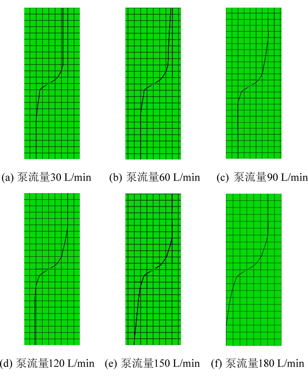 地应力条件为σv=10 MPa、σh=6 MPa、σH=15 MPa条件下,切槽角度45°,不同泵流量裂缝扩展情况如图13所示,裂缝自切槽方向起裂后,迅速转向最大主应力方向,近似呈S型非对称双翼形态,泵流量由30 L/min增加到180 L/min过程中,裂缝扩展路径无明显变化,偏转距相差较小,保持在0.75 m左右,需大幅度提升泵流量来实现对裂缝扩展路径的人工干预。