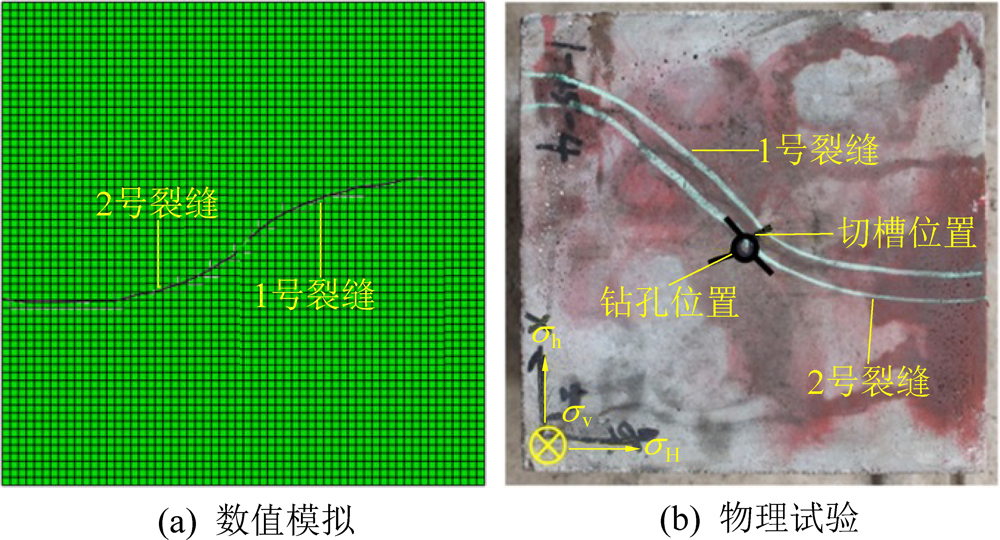 在地应力为σv=10 MPa、σh=6 MPa、σH=12 MPa条件下,设置切槽角度为60°,泵流量为1.0 mL/s,23号试件的结果对比如图3所示,裂缝扩展形态较为接近,数值模拟与物理试验平均偏转距分别为39.0、42.5 mm,两者相差较小,由此可见该数值模型可靠性较高。