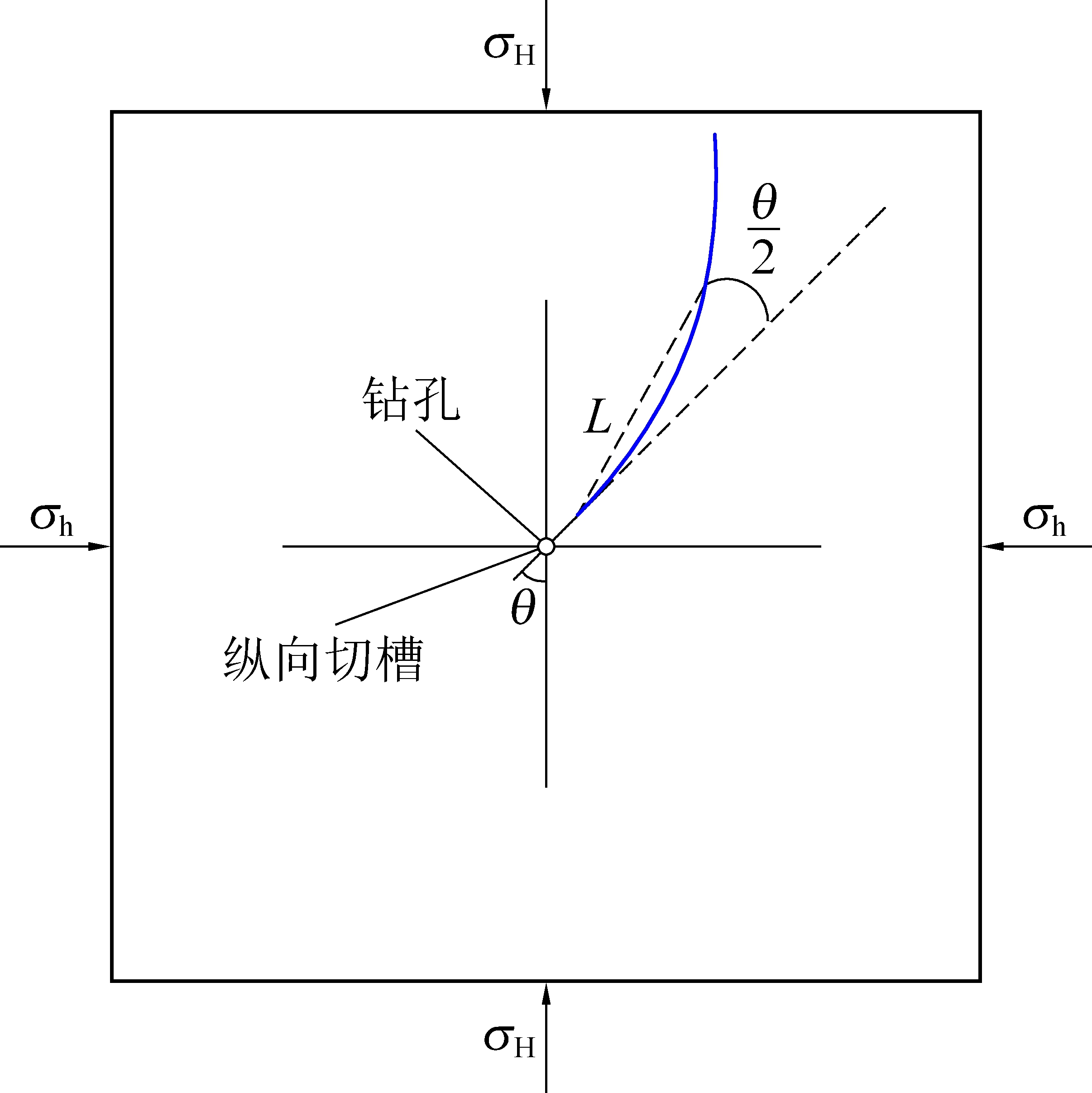 目前基于纵向切槽水力压裂的裂缝扩展规律研究较少[14-16],且未对多因素影响下的裂缝偏转规律展开系统性研究。笔者通过建立纵向切槽水力压裂数值模型,在可靠性得到验证的基础上,对水平应力比、切槽角度以及泵流量对裂缝偏转距(将扩展路径上一点与裂缝开裂点连线与切槽方向呈1/2切槽角度时的长度定义为偏转距)的影响规律展开研究,以期对纵向切槽水力压裂裂缝的扩展规律有更加深入的认识,为水力压裂施工钻孔间距设计提供参考,并尝试对裂缝的扩展路径进行人工干预,进而更好地应用于动压巷道连续切顶卸压等方面。