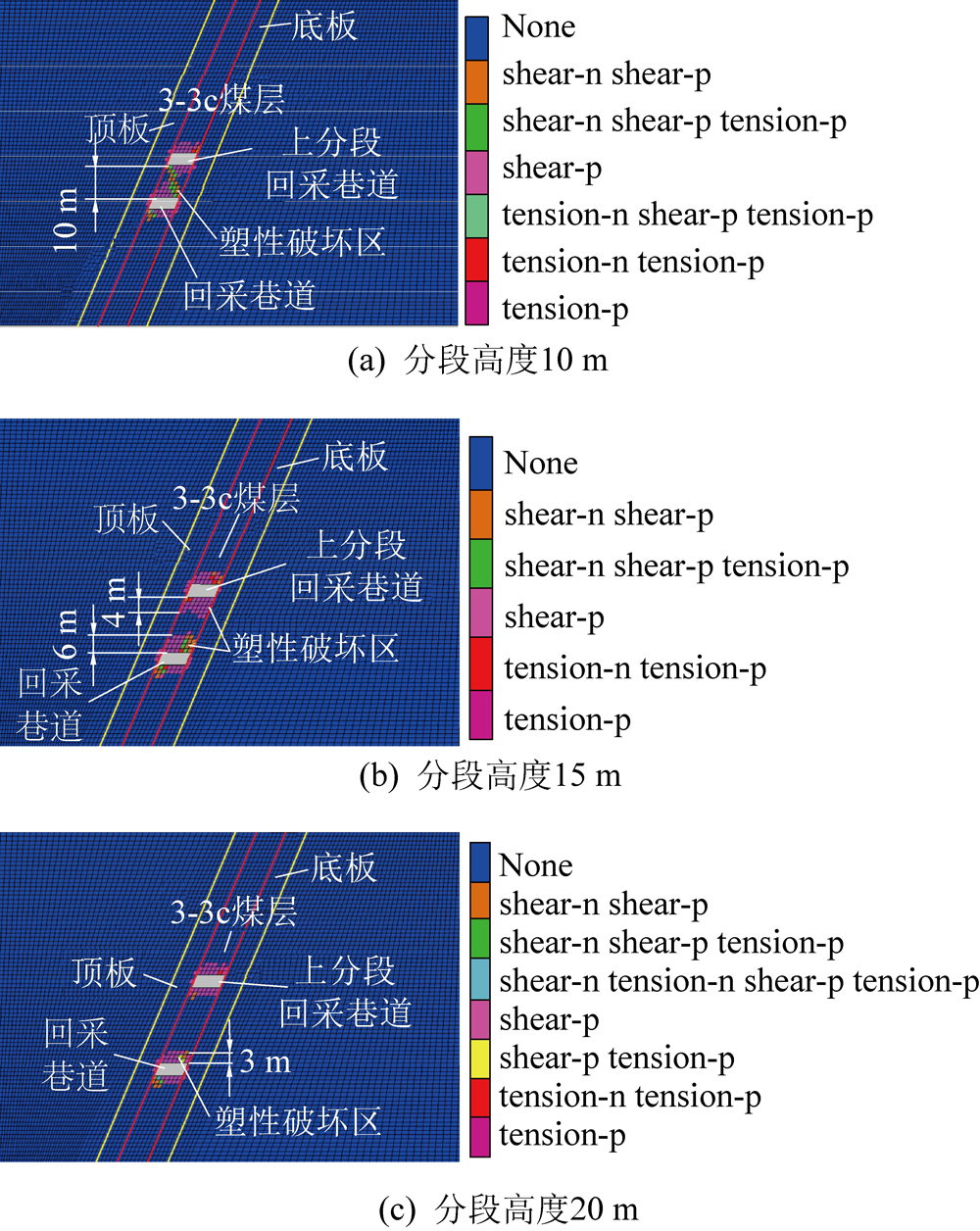 计算得出顶煤平均厚度3.58 m,x1、x2分别为4.49、8.78 m,则分段高度最大20 m,运用FLAC3D有限差分数值模拟软件分别对10、15、20 m三种分段高度条件下顶煤的冒放特性进行分析,模拟结果如图5所示。当分段高度为10 m时,分段内大部分煤体都处于剪切或拉伸破坏状态,顶煤处于应力极限平衡状态。当阶段高度为15 m时,顶板上方4 m左右顶煤发生塑性破坏,而顶煤中部厚度5 m左右煤层比较完整,未发生塑性破坏,对顶煤冒放性影响较大。当阶段高度达到20 m时,只有顶板以上3 m顶煤发生破坏。阶段高度越小,巷道掘进工程量越大,成本越高,加大采放比可显著降低矿井生产成本。因此,为保证顶煤有条件自由破碎松散的空间,采用分段高度为10 m,满足采用低位放煤插板式放煤支架的水平分段高度应为≤19.5 m。