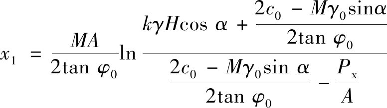 其中:M为煤层厚度,m;A为侧压系数;α为煤层倾角,(°);H为采深,m;φ0为煤层界面内摩擦角,(°);c0为煤层界面黏聚力,MPa;k、k′分别为平衡区x1和x2应力集中系数;γ为上覆岩层平均容重,kN/m3;γ0为煤层容重,kN/m3;Px为支护阻力;P1为上分段回采巷道支护阻力,kPa;f为煤层与顶底板接触面摩擦因数;ε为三轴压力系数;c为黏聚力,MPa。