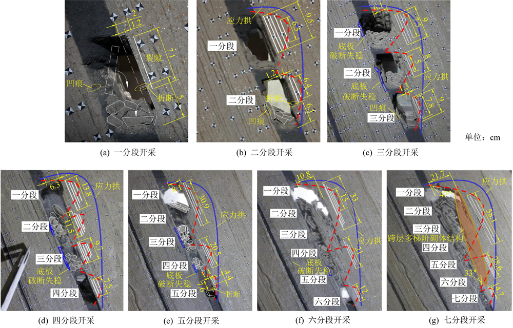 由图6可得各分段破坏特征:①一分段开采后,直接顶中下部(0.4L)位置断裂、垮落,垮落高度1.2 cm,断裂位置下岩梁以下端点为中心发生顺倾向旋转滑落,断裂位置上岩梁以上端点为中心发生逆倾向旋转滑落,裂隙发展高度2 cm。垮落岩块对底板中下部区域冲击扰动,底板裂隙发展深度0.7 cm(图7a)。②二分段开采后,二分段顶板运移特征与一分段开采时相似,由于二分段开采扰动,一分段顶板裂隙进一步纵向延伸至6.1 cm高度、横向延伸但未贯通二分段顶板(图7b)。③三分段开采后,三分段直接顶垮落1.2 cm,受三分段开采扰动影响,顶板第2次垮落,一、二分段顶板垮落高度分别为6.1、4.0 cm,一、二分段顶板裂隙横向延伸贯通、纵向延伸高度发展分别达到12.2、6.2 cm,一、二分段底板出现滑移失稳(图7c)。④四分段开采后,受开采扰动影响,一、二分段煤柱失稳,一、二、三分段贯通,顶板第3次垮落,一、二分段顶板垮落高度分别为6.3、4.0 cm(图7d)。⑤五分段开采后,三分段煤柱失稳,一至四分段贯通,顶板第4次垮落,一分段顶板垮落高度大8.1 m,裂隙纵向发展高度达15.6 cm,二、三、四分段受垮落矸石充填支撑作用,未发生进一步垮落,但裂隙进一步纵横向发展(图7e)。⑥六分段开采后,四分段煤柱失稳,五分段与上部采空区贯通,顶板发生第5次垮落,一、二、三分段顶板垮落高度10.8 cm、裂隙高度20.6 cm,四分段顶板垮落高度6.1 cm、裂隙高度15.6 cm,五分段顶板裂隙纵横向进一步延伸(图7f)。⑦七分段开采后,顶板发生第6次垮落,垮落高度达到21.7 cm,裂隙发展高度33.1 cm(图7g)。上垮落角为47°,下部垮落角为33°。
