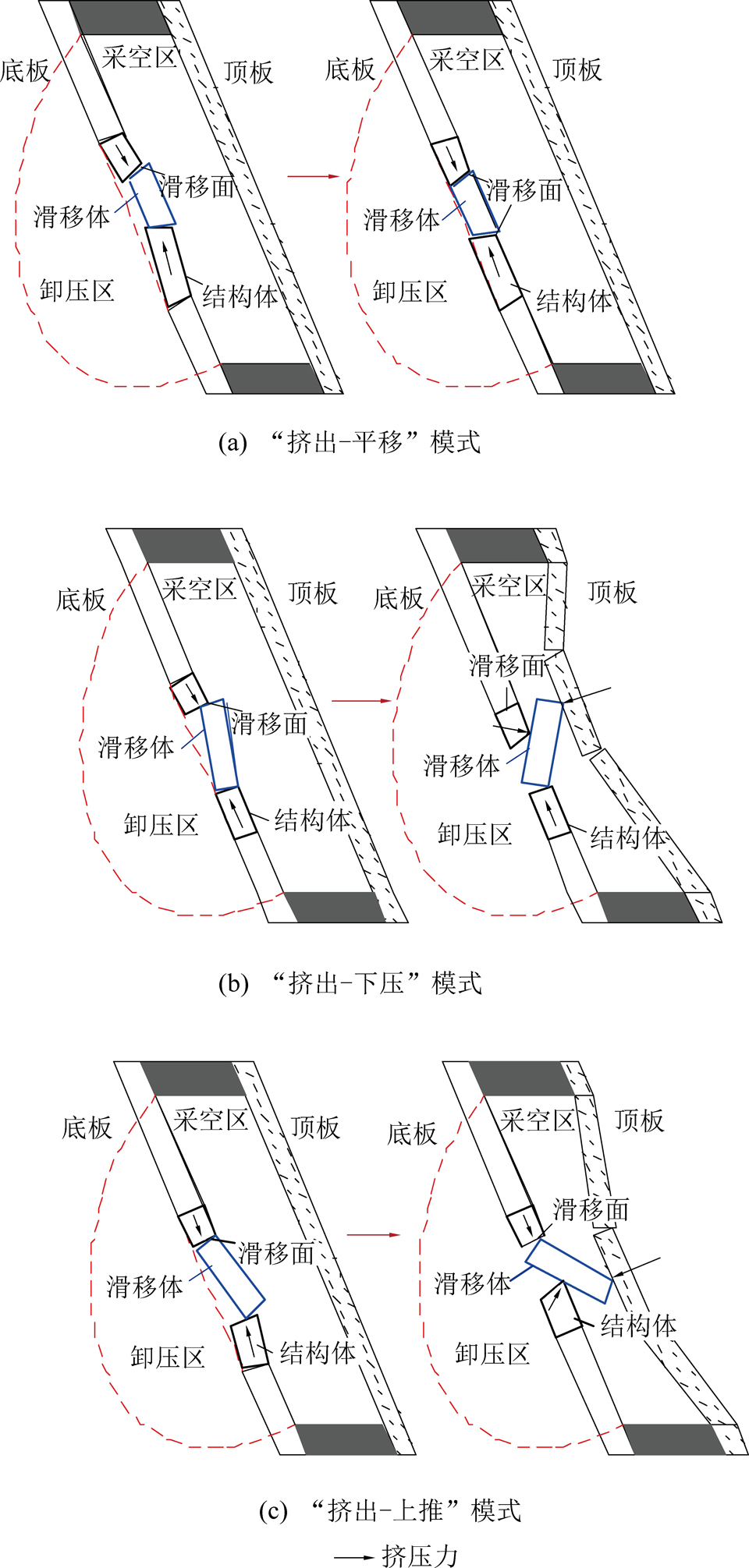 底板破坏滑移是急倾斜煤层开采的一种围岩破坏灾害现象,有一个随时间和空间发展的过程。造成底板破坏的主要因素众多,开采应力环境是主要原因。研究表明,地下煤层处于原岩应力场中的应力环境比地面自重应力高几个量级,急倾斜分段煤层采出使底板在原岩应力环境下产生向采空区鼓起卸载运动,当鼓起到峰值后,选择性产生结构破坏而形成不同形状的滑移体,处于相对平衡状态,受开采扰动影响,相对平衡状态破坏且具有滑移空间时,底板岩层会出现“挤出-平移”“挤出-下压”“挤出-上推”等3种破坏滑移模式(图9)。