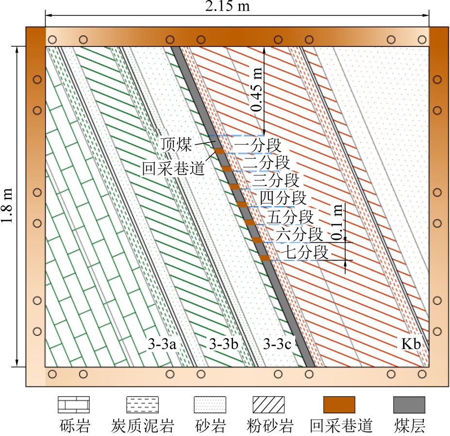 根据龙泉煤矿的生产技术条件及煤岩层物理力学性质,采用可变角度平面物理相似模拟实验平台(外形尺寸2 150 mm×200 mm×1 800 mm),按照相似理论以河沙、煤灰作为骨料,石膏、大白粉(碳酸钙)为粘结材料,云母粉为分层材料,制作几何相似比1∶100 的物理相似模型,模型中3-3c煤层采用水平分段短壁综放开采方法进行开挖。自上而下分7个分段进行回采,分段高度10 m,首先沿分段布置回采巷道(宽4.8 cm×高2.6 cm),然后分3轮进行放顶煤,具体开采布置方案如图6所示。