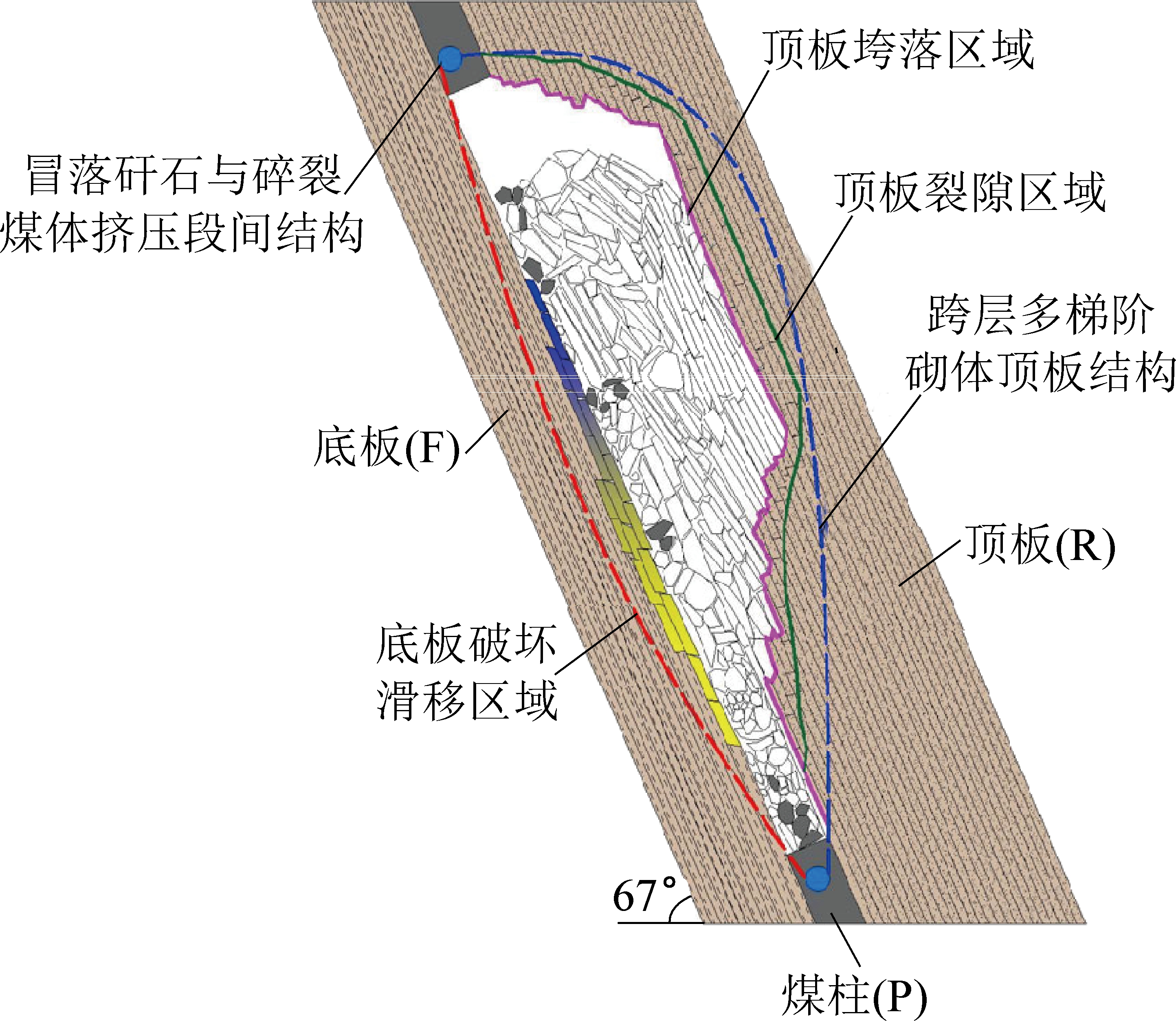 急倾斜煤层开采过程中,顶板结构区域迁移转化形成“跨层多梯阶砌体结构”,底板沿潜在滑移面破坏滑移,分段煤柱受顶底板夹持效应影响形成局部-整体破坏,破裂煤柱与冒落矸石、顶底板等在尺度上存在时空关联性,整体形成采场围岩承载结构。相对于近水平或缓倾斜煤层开采采场围岩承载结构稳定性主要受“关键层”控制,急倾斜煤层开采采场围岩承载结构要素多样,主要由顶板跨层多梯阶砌体结构、底板破坏滑移、分段煤柱等构成,顶板结构、底板破坏滑移沿倾向分布范围广泛,起控制作用的关键岩块所处岩层多变,形成该类煤层围岩承载结构泛化特征,如图10所示。该承载结构的构成元素顶板、分段煤柱、底板等通过应力/载荷传递相互关联,形成“顶板-煤柱-底板(roof-pillar-floor,R-P-F)”链式结构。一分段开采时,顶板(R1)、底板(F1)通过分段煤柱(P1、P2)间应力传递形成链式结构;多分段开采时,顶板(R1、R2,…,Rn)、底板(F1、F2,…,Fn)通过分段煤柱(P1、P3,…,Pn+1)间应力传递形成强弱链结构。“R-P-F”链式结构的稳定是一个非线性动力学问题,链式结构与外部开采环境相互作用,内部结构单元间通过强弱链相互关联,强链控制围岩空间大面积动力失稳、弱链控制围岩局部破坏,采动过程中结构单元间强弱链相互转换,形成急倾斜煤层开采围岩灾害孕育、发展、演变动态过程。