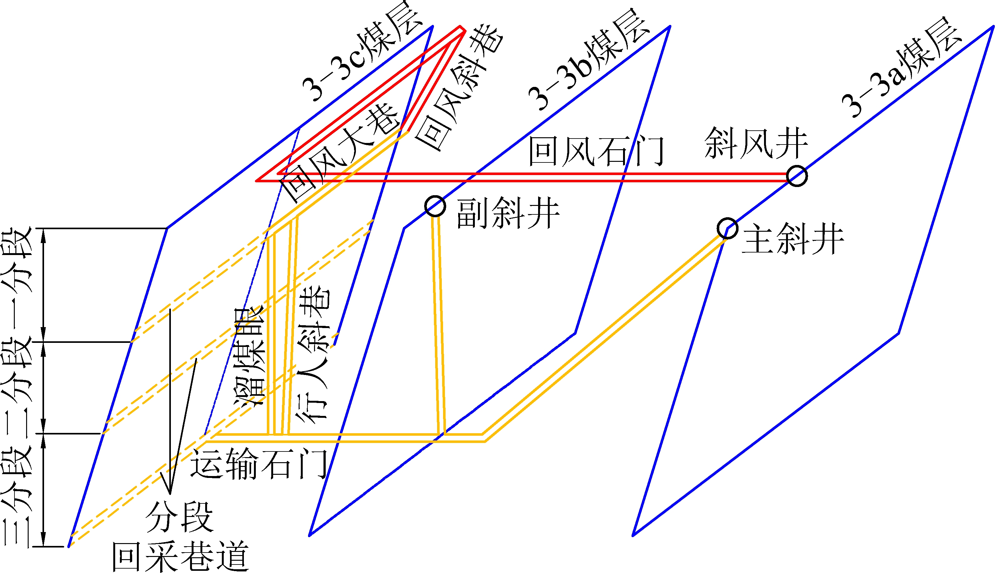 矿井采用单水平斜井开拓方式(图1)。主斜井井口标高+942 m,倾角16°,至井底斜长918 m,井筒净宽5.0 m,净断面18.3 m2,担负全矿井的煤炭及人员提升任务,兼作进风井和安全出口。副斜井沿3-3b煤层倾斜布置,井口标高+942 m,倾角18°,至井底斜长637 m,井筒净宽3.6 m,净断面10.8 m2,担负全矿井的设备、材料及矸石等提升任务,兼作进风井和安全出口。斜风井井口标高+945.4 m,倾角18°,至井底斜长631 m,井筒净宽3.8 m,净断面14.1 m2,担负全矿井的回风任务,兼安全出口。矿井主斜井、副斜井及斜风井分别承担采区上山功能,分别担负采区的煤炭运输、辅助提升及通风任务。采区采用联合布置开采,在采区各区段运输、回风水平从副斜井布置甩车场及石门揭露各煤层。