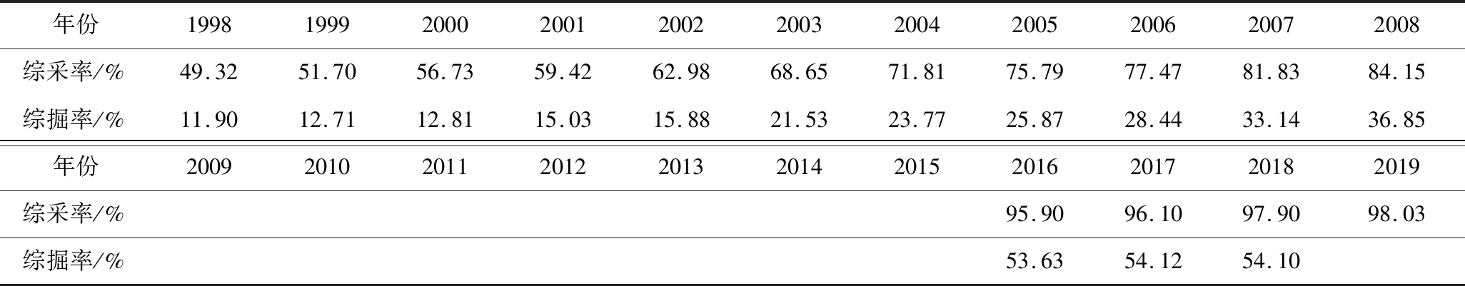 年份19981999200020012002200320042005200620072008综采率/%49.3251.7056.7359.4262.9868.6571.8175.7977.4781.8384.15综掘率/%11.9012.7112.8115.0315.8821.5323.7725.8728.4433.1436.85年份20092010201120122013201420152016201720182019综采率/%95.9096.1097.9098.03综掘率/%53.6354.1254.10