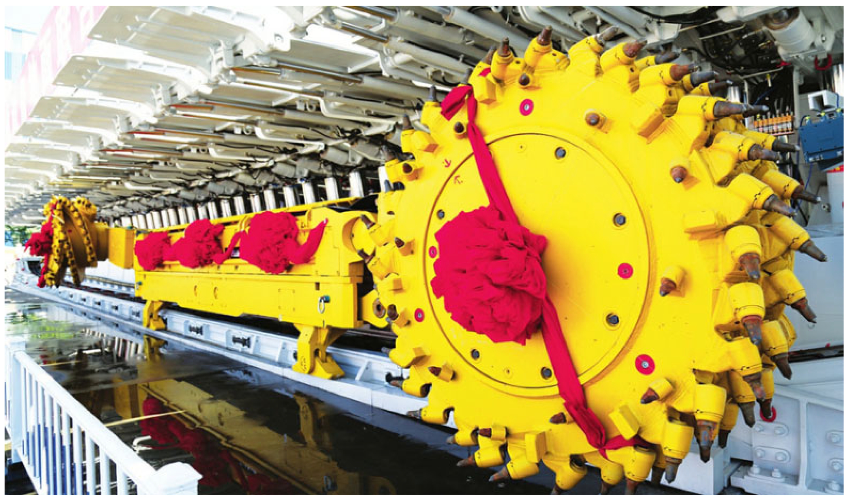 我国电牵引采煤机经过多年引进消化吸收和自主创新,已经形成了割煤高度满足0.8~8.8 m,能适应倾角0°~60°的系列化产品。目前,国产在用采煤机装机功率最大达3 030 kW(图8),最大落煤能力达6 000 t/h,牵引速度超过20 m/min,逐步攻克了采煤机结构刚性和可靠性、摇臂润滑和冷却、智能感知和控制等技术难题。目前,大量创新技术在国产采煤机上逐步得以应用,如“T”型对接面技术,在轻量化的同时有效提升了机身连接刚性;箱式拉杠预紧连接技术,实现了行走与机身的可靠连接;长摇臂多腔润滑技术与冷却系统多单元分布式布置方法,解决了摇臂在大倾角工作状态下温升问题;微合金壳体铸造材料,综合性能指标接近进口产品水平;在电传控制系统方面,部分采煤机创新采用了数据链技术,总线共模干扰大幅降低。