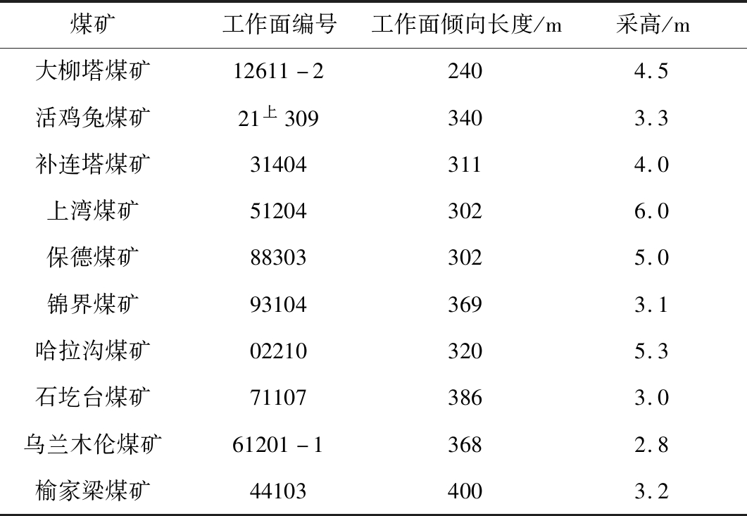 煤矿工作面编号工作面倾向长度/m采高/m大柳塔煤矿12611-22404.5活鸡兔煤矿21上3093403.3补连塔煤矿314043114.0上湾煤矿512043026.0保德煤矿883033025.0锦界煤矿931043693.1哈拉沟煤矿022103205.3石圪台煤矿711073863.0乌兰木伦煤矿61201-13682.8榆家梁煤矿441034003.2