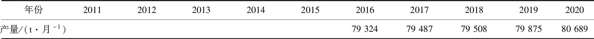 年份2011201220132014201520162017201820192020产量/(t·月-1)7932479487795087987580689