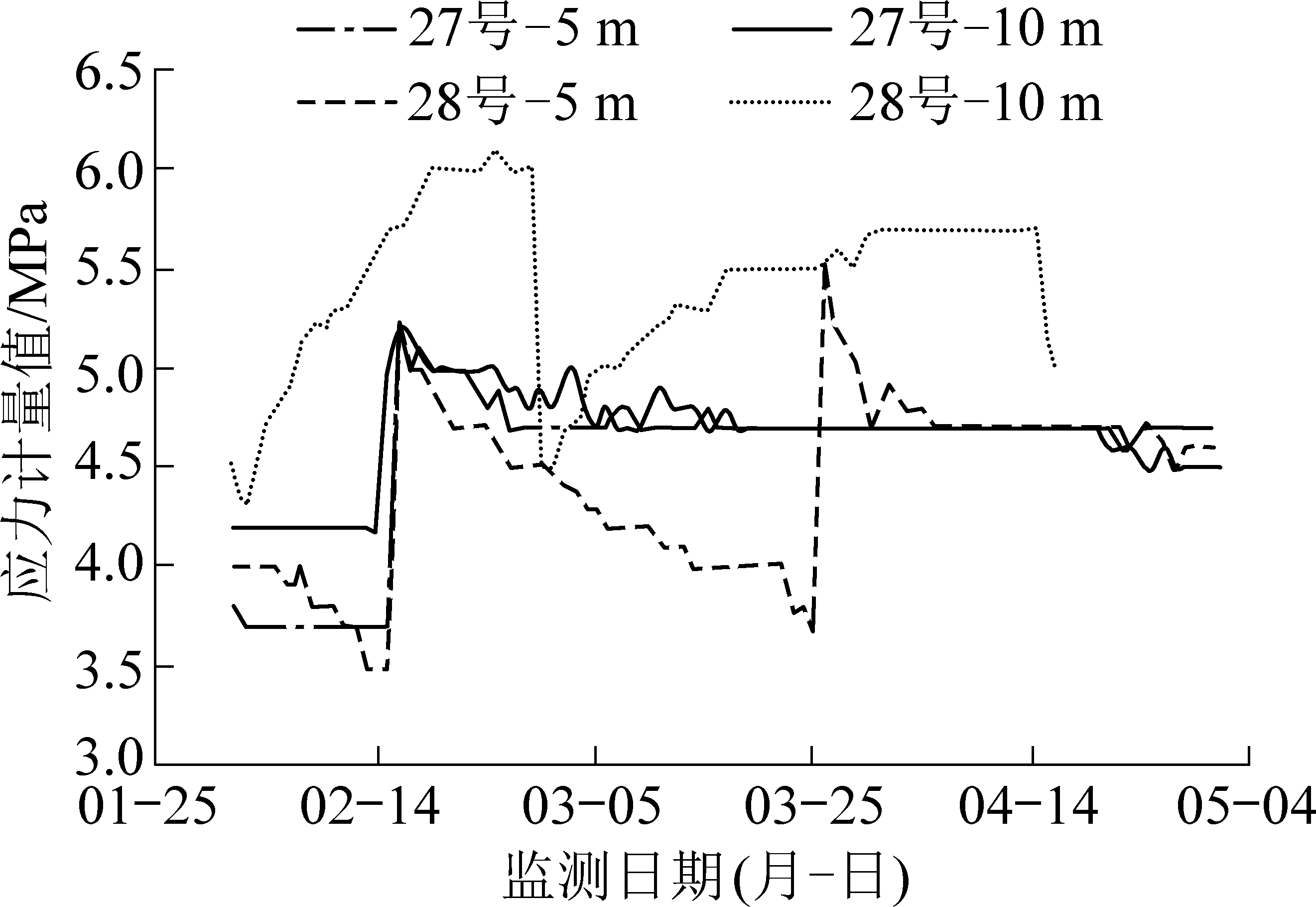 3)钻孔应力监测。 2613 回采工作面下平巷(二段)安装了KJ649 煤矿冲击地压监测系统,每隔25 m 在上帮煤层内安装1 组(2 个)钻孔应力监测计,深度分别为5、10 m,初始预载压应力4.5 MPa,掘巷初期3 个月内煤层应力变化曲线如图6 所示。