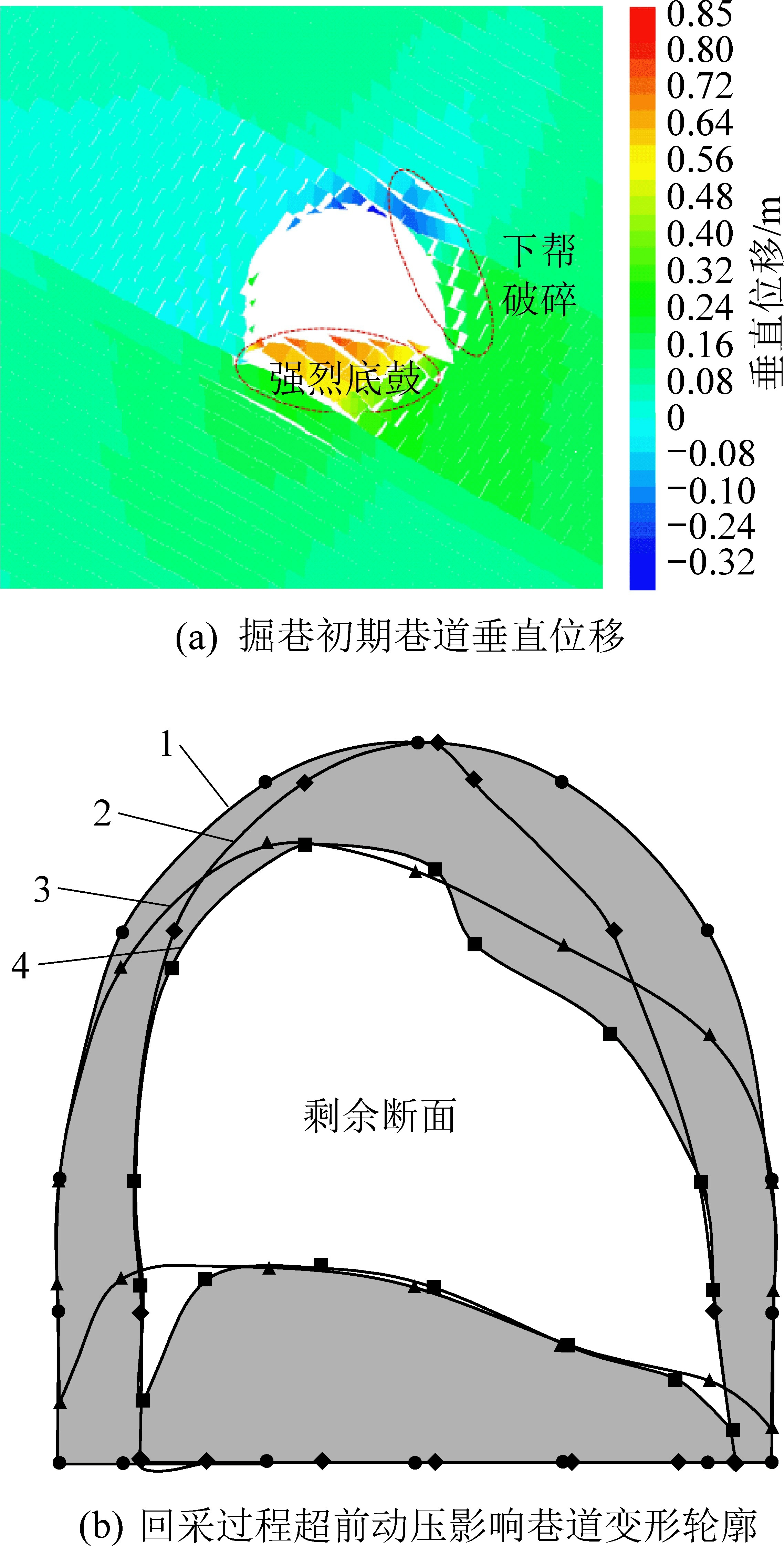 依据现场地质力学测量,采用3DEC 离散元模拟软件研究2613 回采工作面下平巷在掘进和回采全阶段的围岩应力重新分布与变形破坏情况。1 300 m 埋深垂直地应力为32.5 MPa,第一、第二水平主应力分别为30.3、16.8 MPa。 巷道破坏模拟结果如图3a 所示,巷道开挖后围岩表面受卸载差应力作用发生快速破坏,断面呈现非均匀性变形破坏特征,超深煤层巷道中,受岩层大倾角地质特征的影响,巷道下拱部及下帮位移量和底鼓量较大。